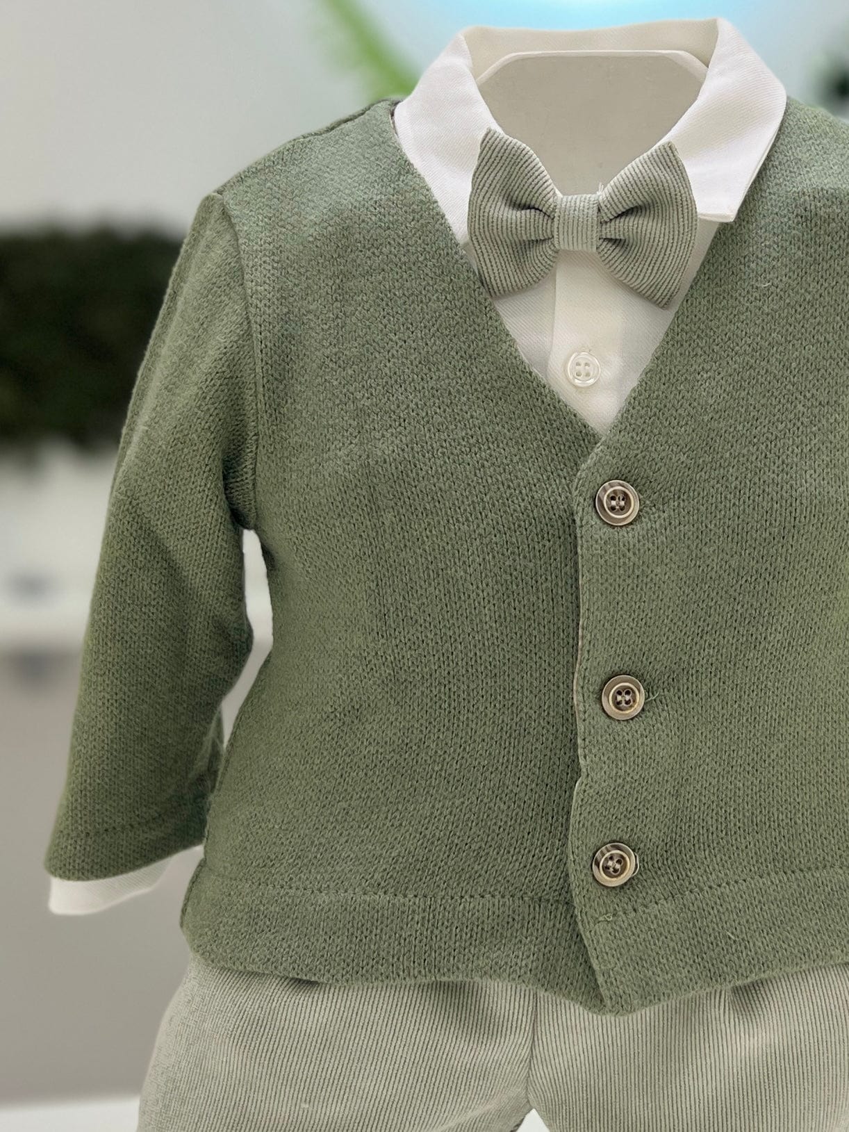Un cardigan per bimbo in maglina verde, morbido e leggero, con bottoncini marroni che aggiungono un contrasto caldo e elegante.