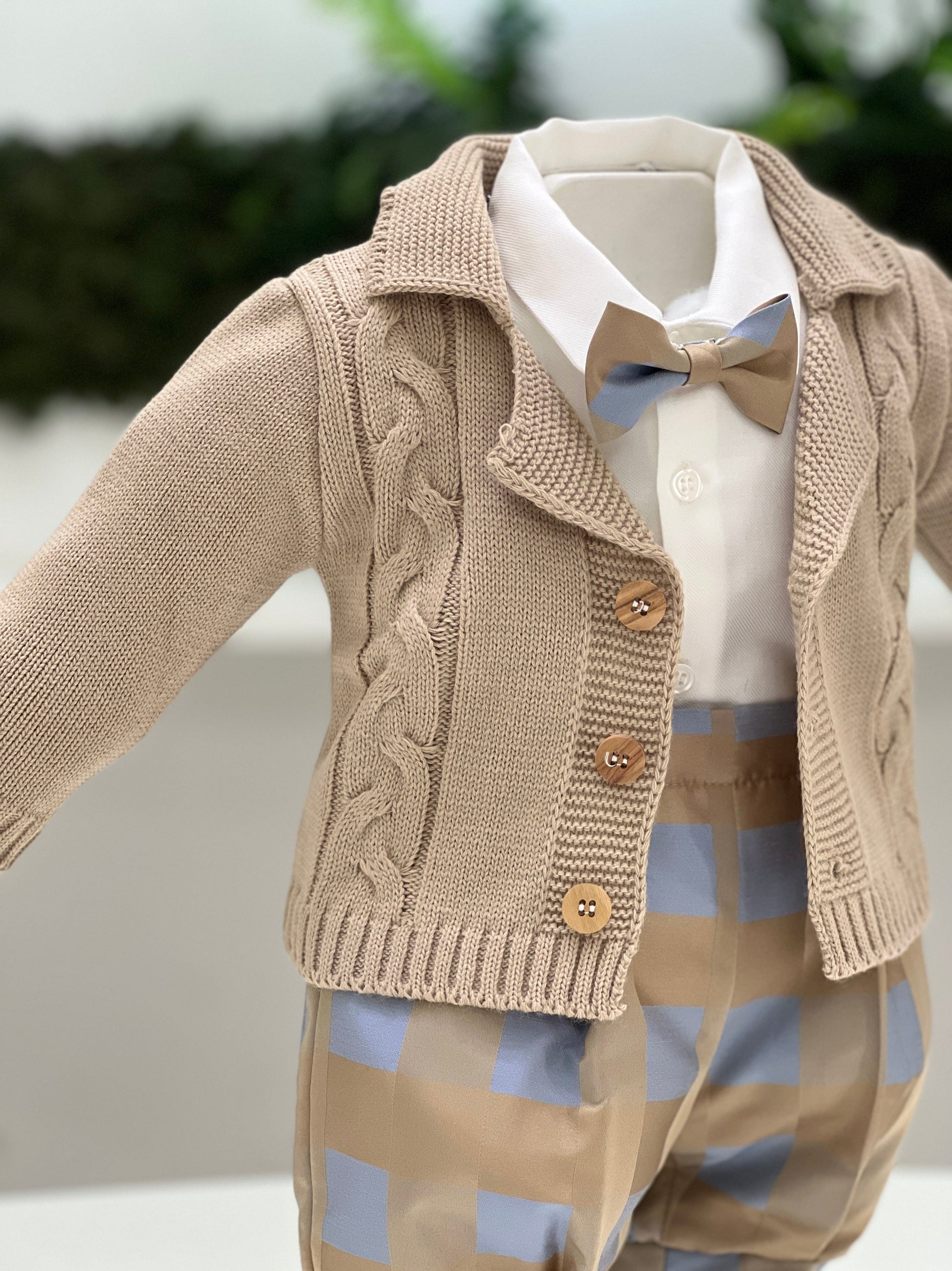 Un cardigan per bimbo in lana tricot, caldo e morbido, con un design accogliente e classico. I bottoncini in legno aggiungono un tocco naturale e rustico, completando il look con eleganza.
