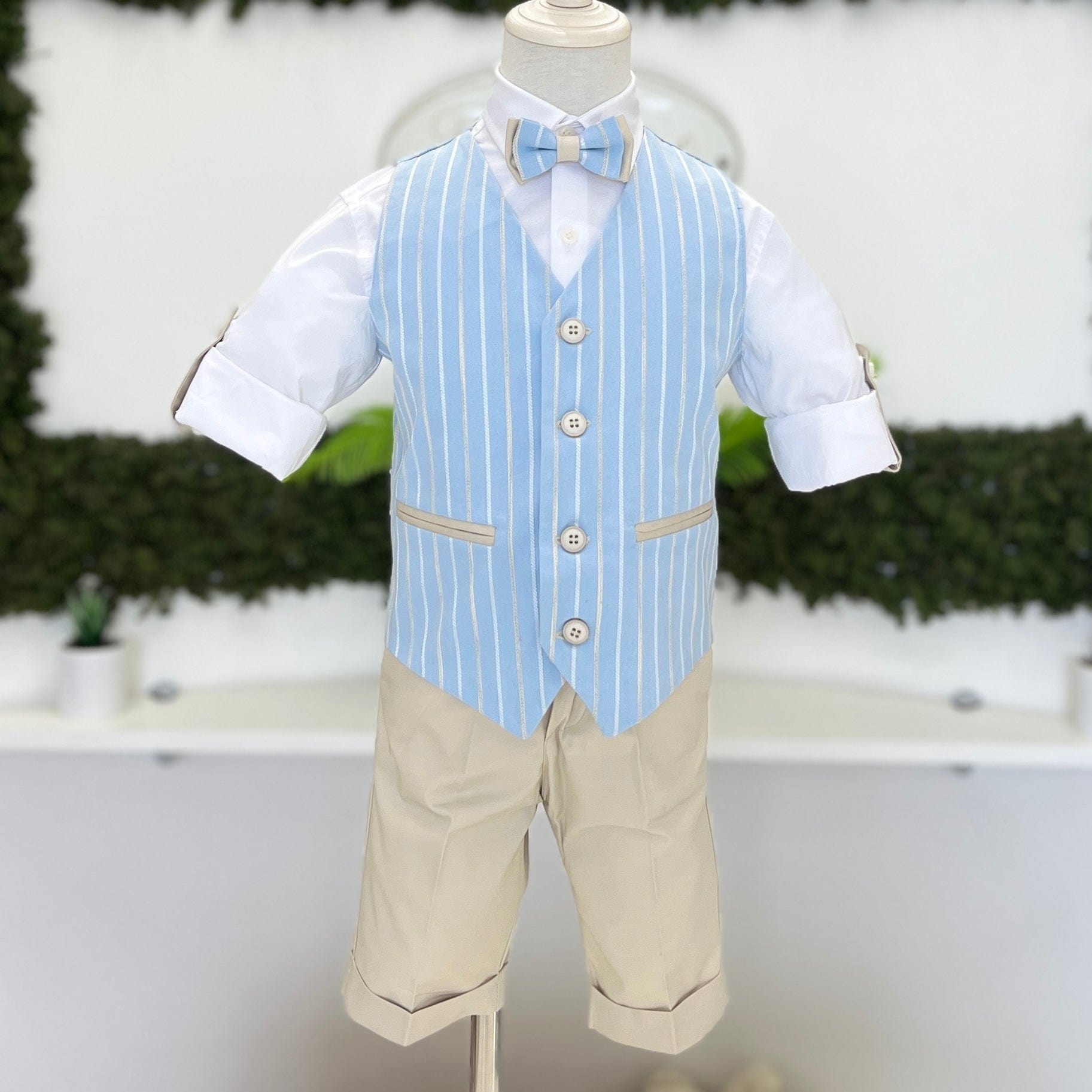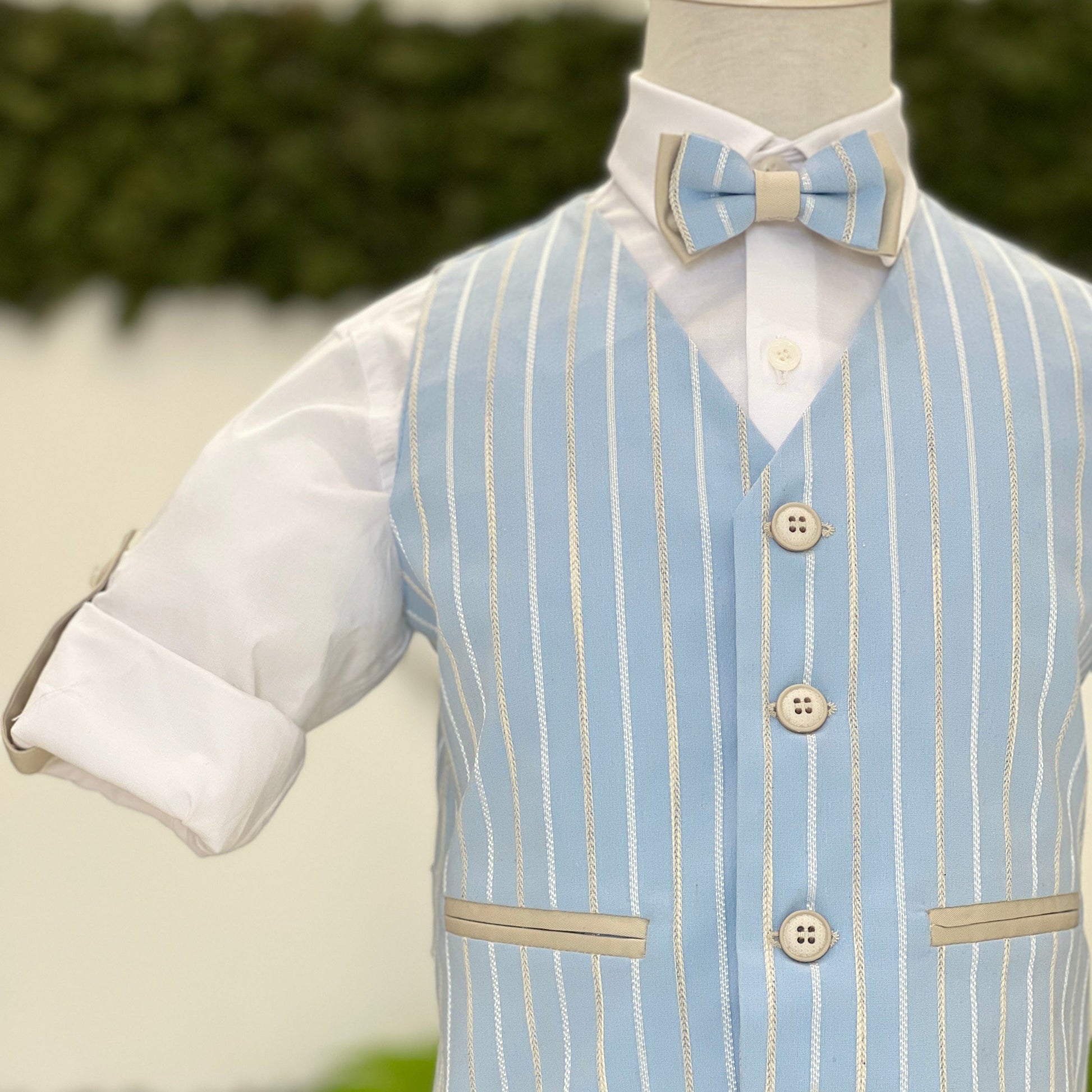 Un completo elegante e armonioso, ideale per le occasioni speciali. Il gilet celeste a righe beige, raffinato e dal fascino senza tempo, si abbina perfettamente alla camicia con profilo beige, curata nei dettagli per un tocco di stile distintivo. I bermuda beige in cotone, versatili e ben strutturati, completano l’insieme con equilibrio. Il papillon coordinato aggiunge un dettaglio ricercato, rendendo questo completo una scelta impeccabile per un’eleganza naturale e sofisticata.