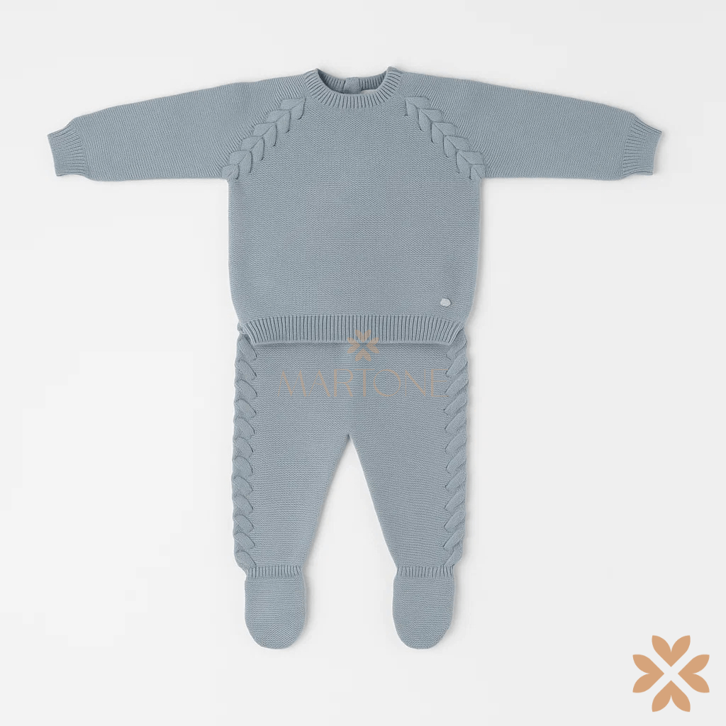 Tutina spezzata in maglia composto da maglia a maniche lunghe con lavorazione intrecciata sulle spalle e pantalone con piedini e stesso motivo lungo i lati.