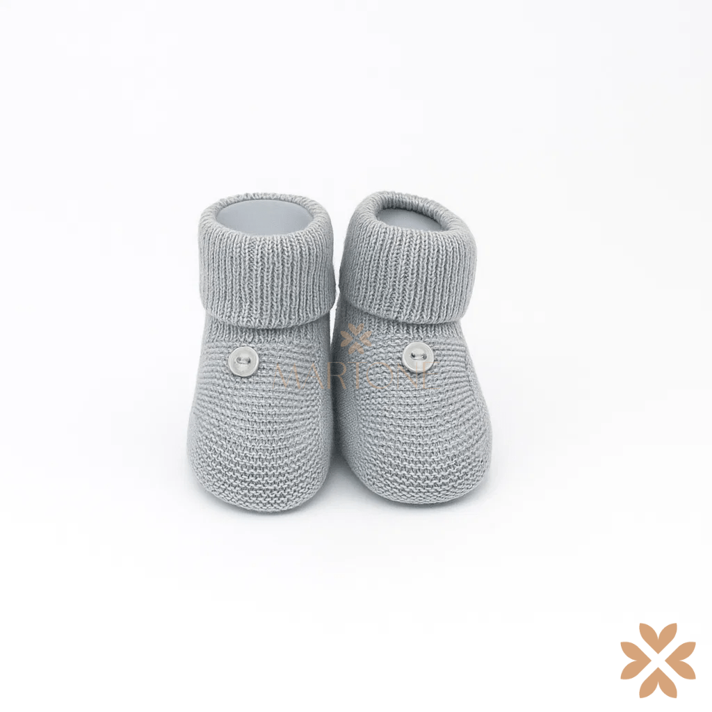 Babbucce neonato in lana con risvolto alla caviglia e bottoncino decorativo applicato sulla parte superiore.