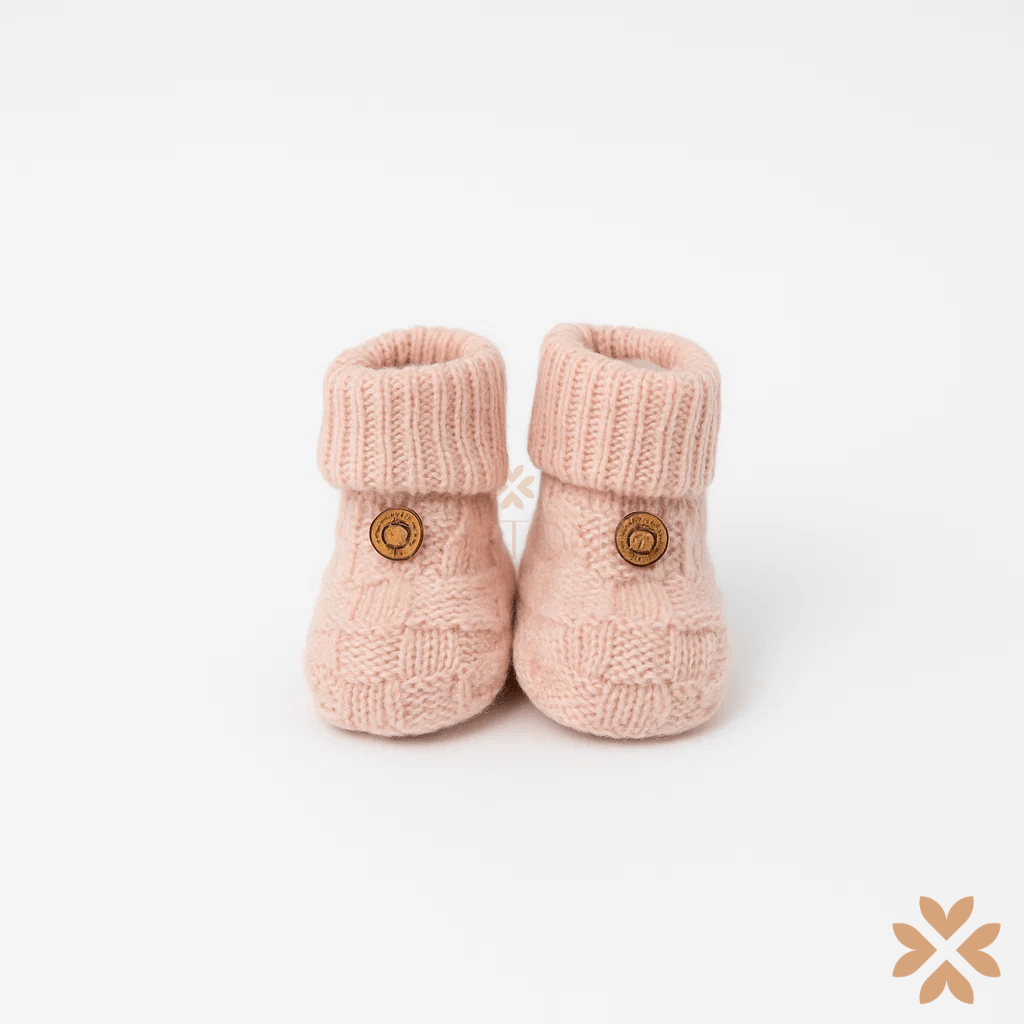 Babbucce neonata in lana con lavorazione a scacchi in rilievo e bordo a costine, complete di laccetto alla caviglia.