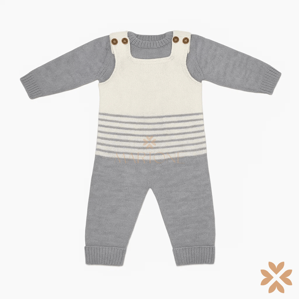Completo due pezzi in 100% lana grigio melange composto da maglia a maniche lunghe con collo tondo e salopette panna con righe orizzontali grigie, bretelline e bottoni sul davanti.