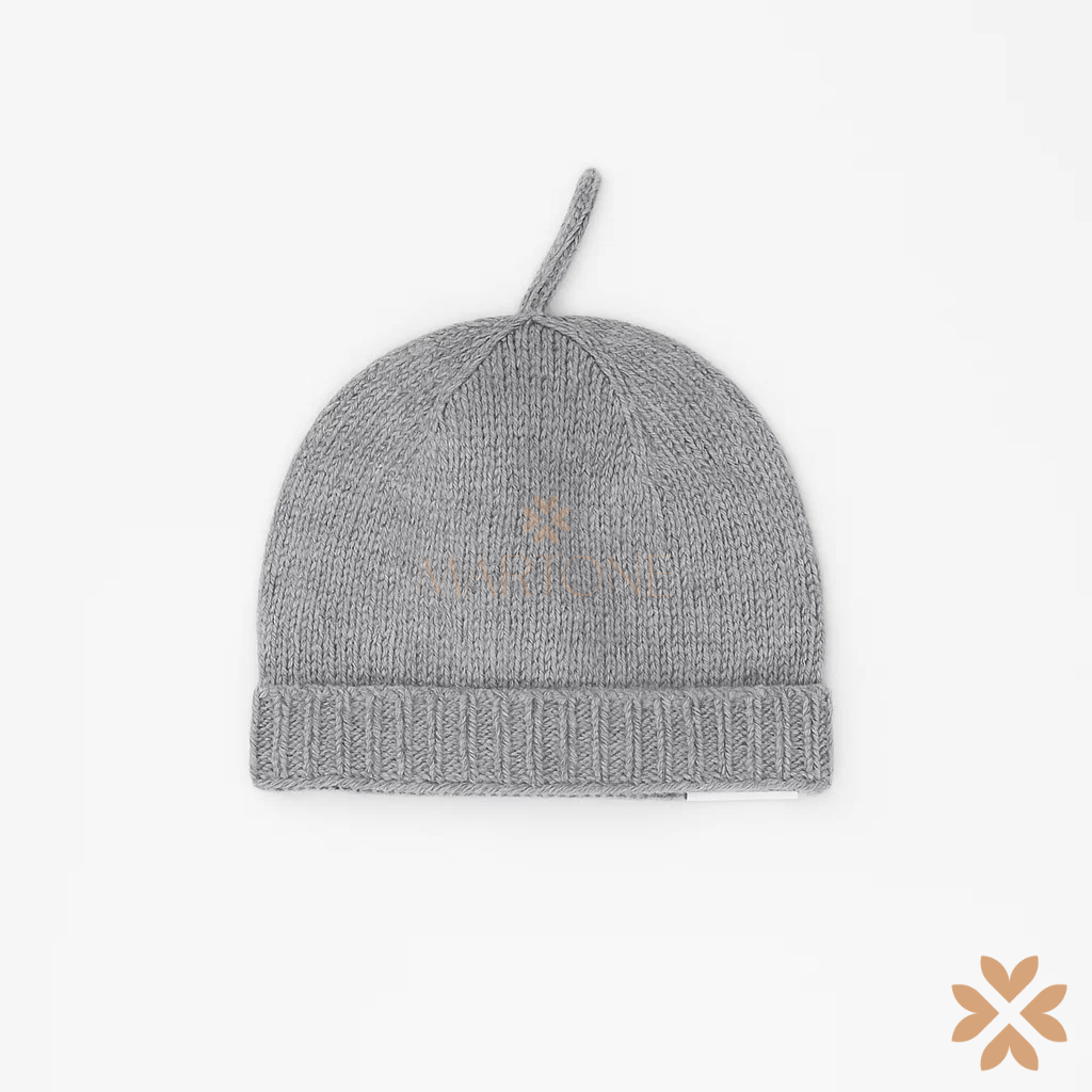 Cappellino in maglia grigio chiaro con risvolto a costine e piccolo nodo sulla sommità.