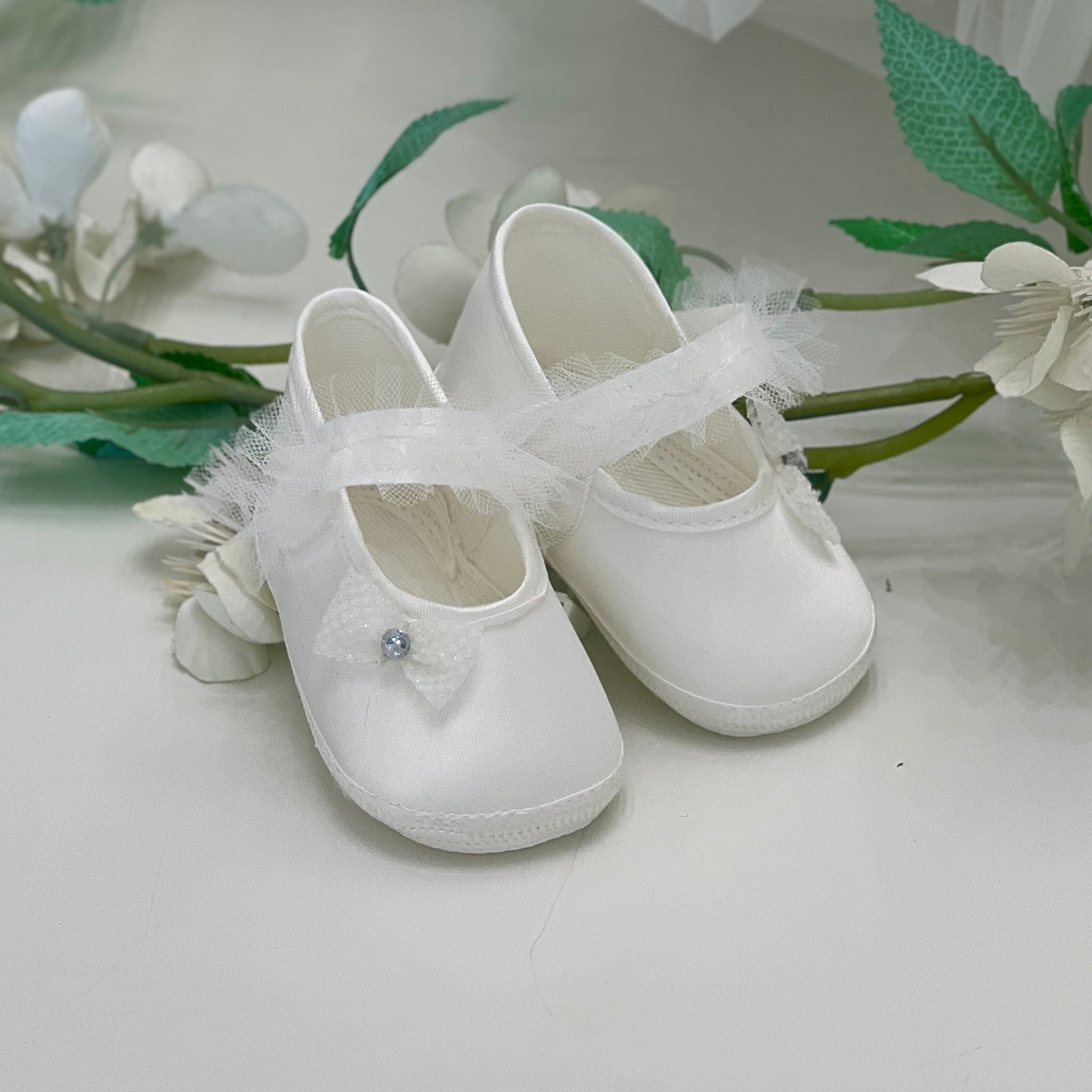 Scarpina battesimale per neonata, cinturino impreziosito da tulle con chiusura laterale e fiocchetto, un accessorio elegante e studiato nei minimi dettagli per completare il look della tua piccola nel giorno del suo battesimo.