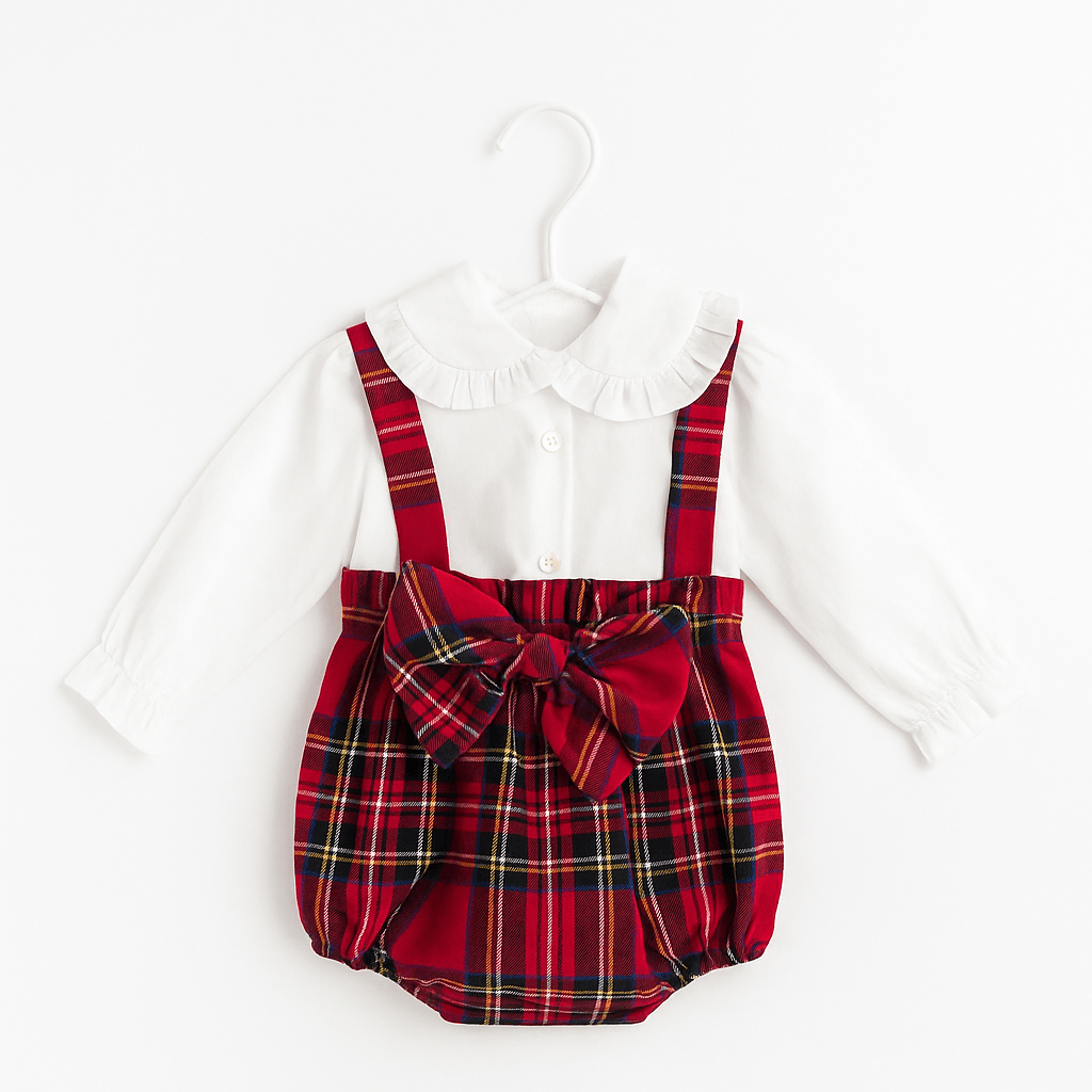 Pagliaccetto tartan con bretelle e maxi fiocco frontale, abbinato a camicia avorio con colletto arricciato. Un classico natalizio dal carattere impeccabile.