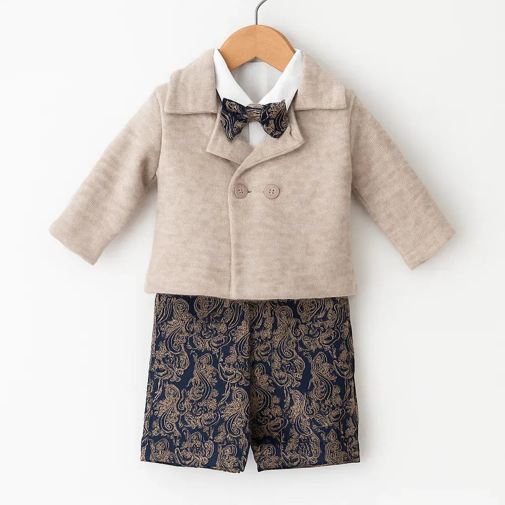 Completo elegante per neonato composto da camicia con colletto classico, papillon in tessuto jacquard e giacca doppiopetto in tonalità beige con rever morbido. Il look è completato da bermuda in jacquard blu e oro dal motivo paisley. Un insieme ricercato, sofisticato e perfetto per cerimonie e occasioni speciali.