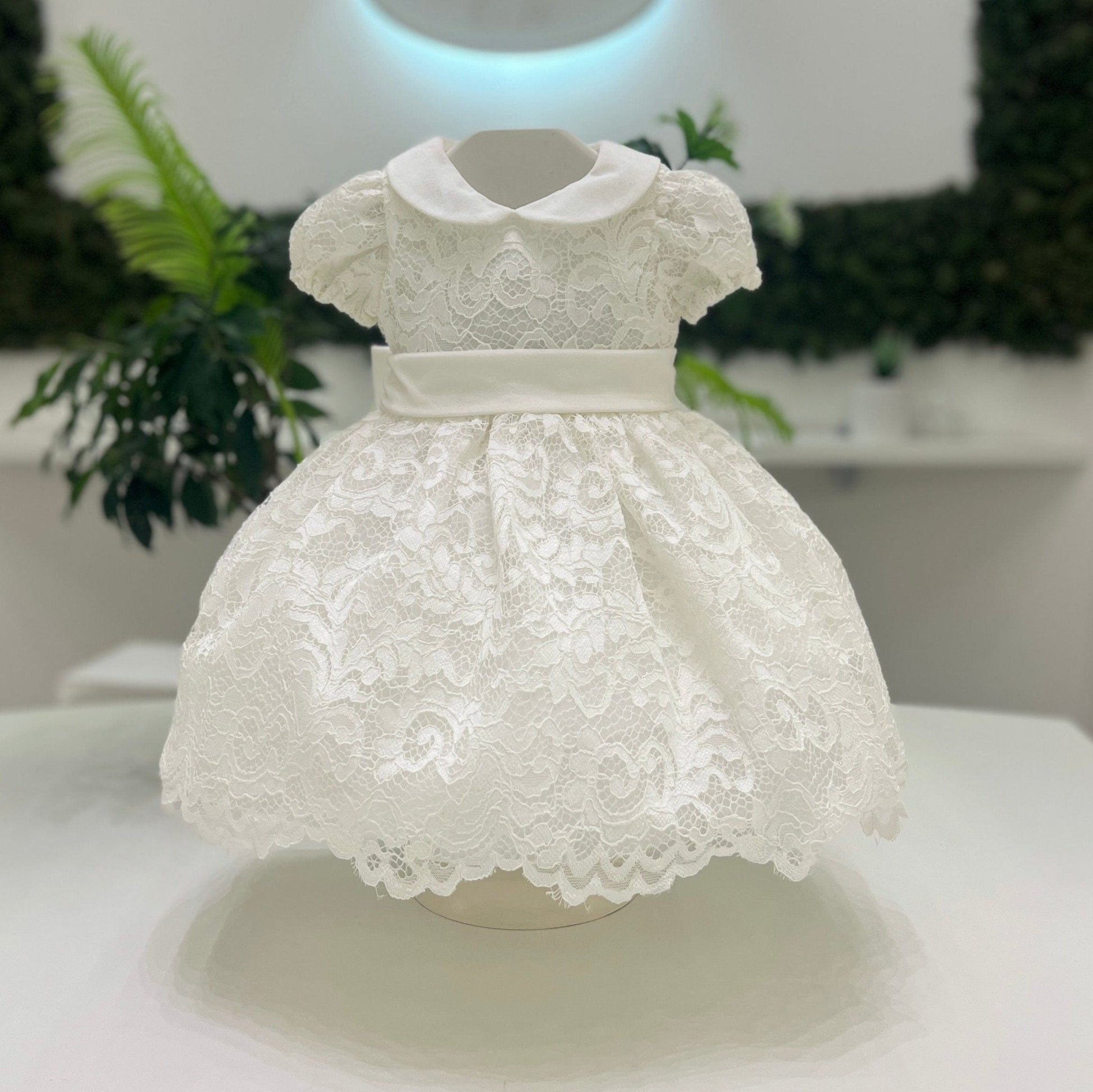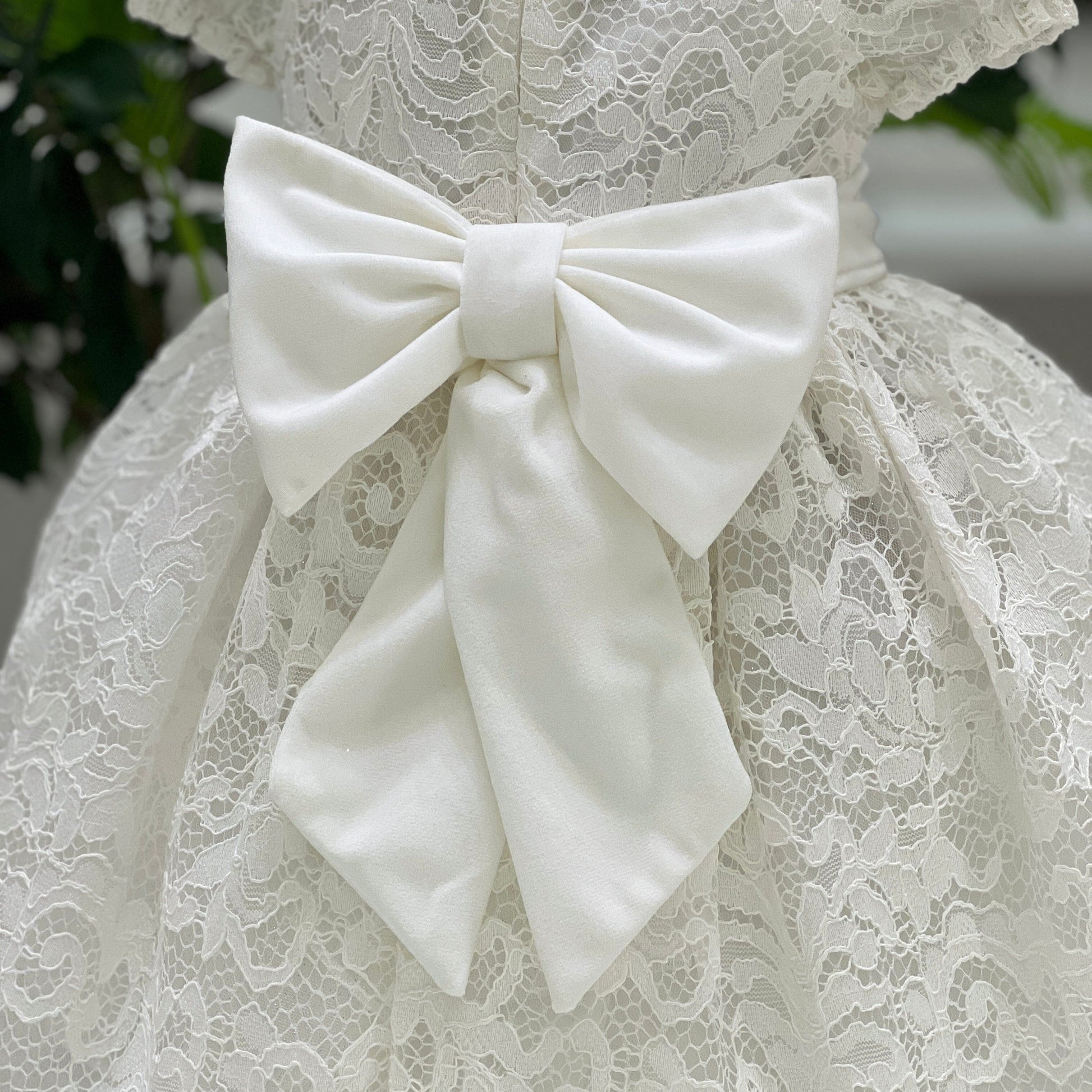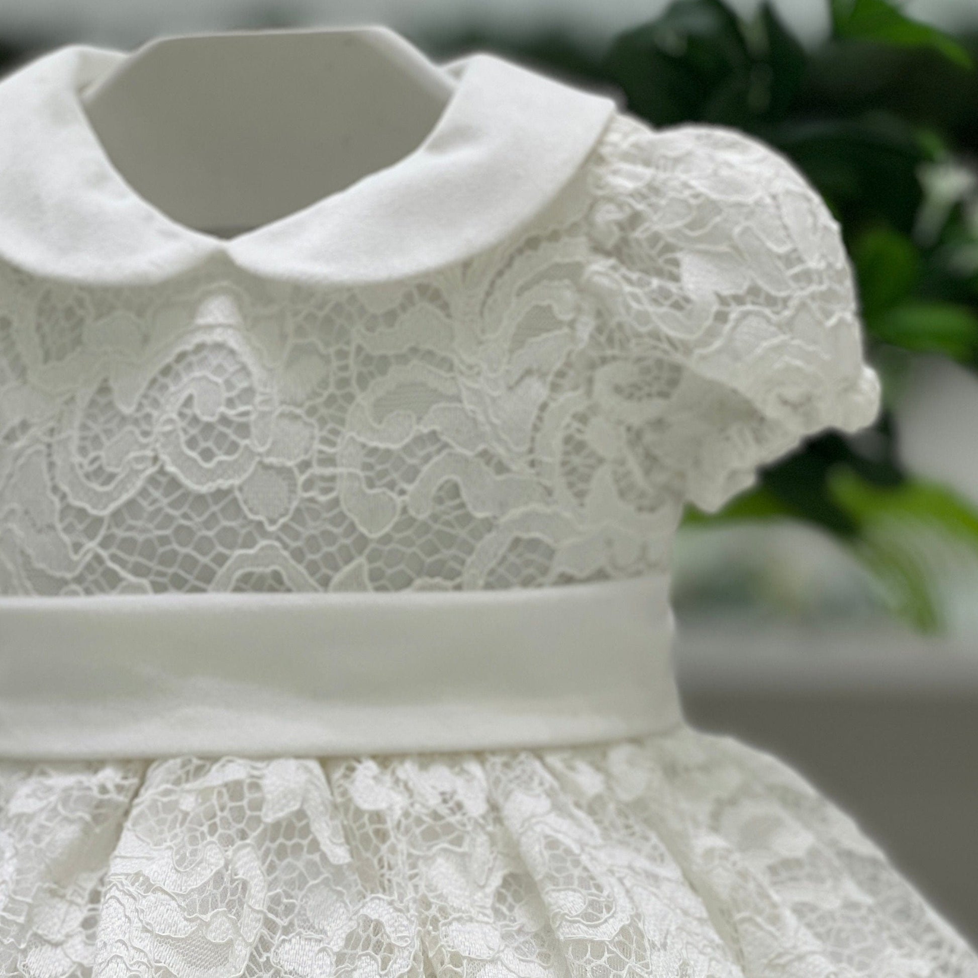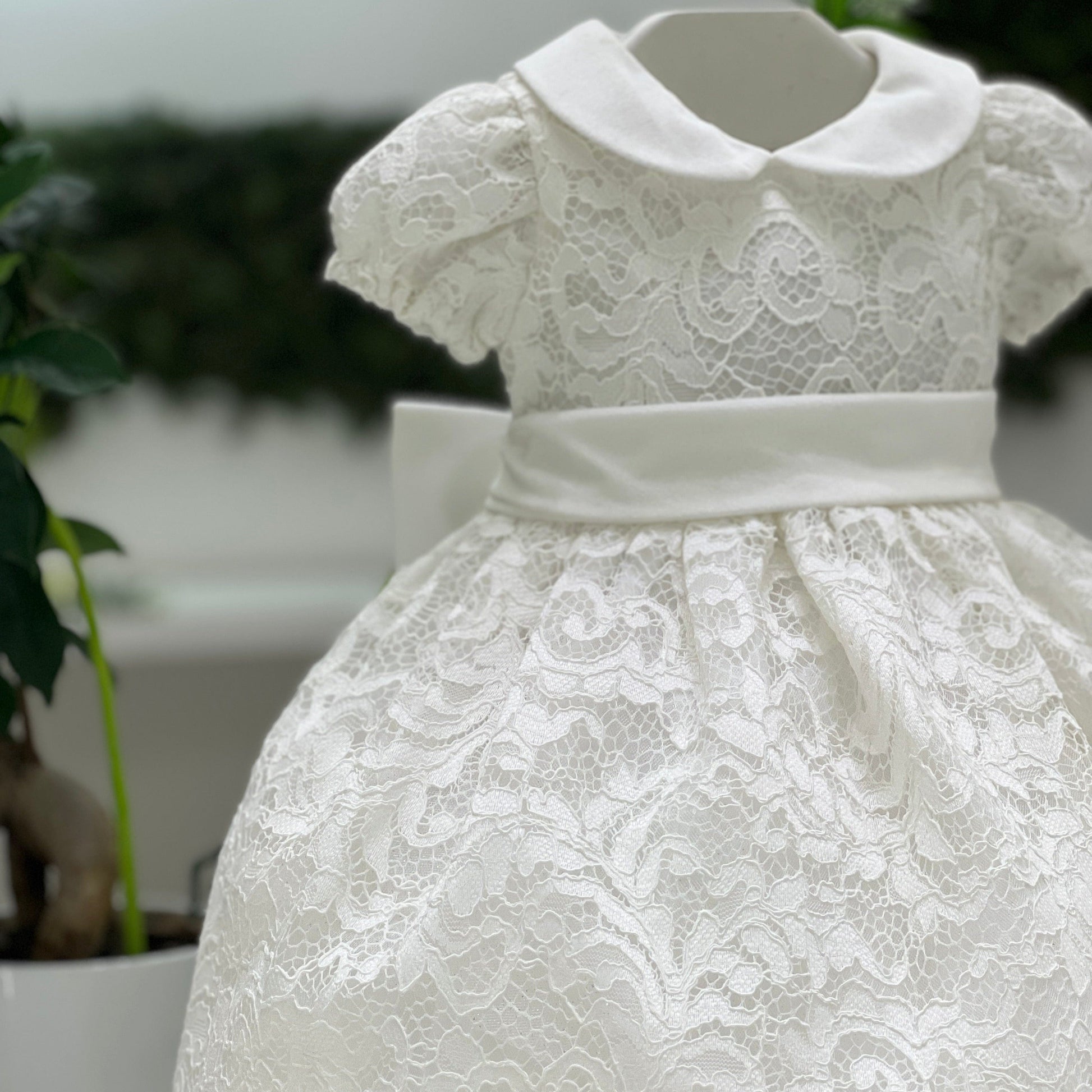 Abito battesimale realizzato interamente in pizzo, con colletto e cintura in velluto con fiocco rigido sul retro.