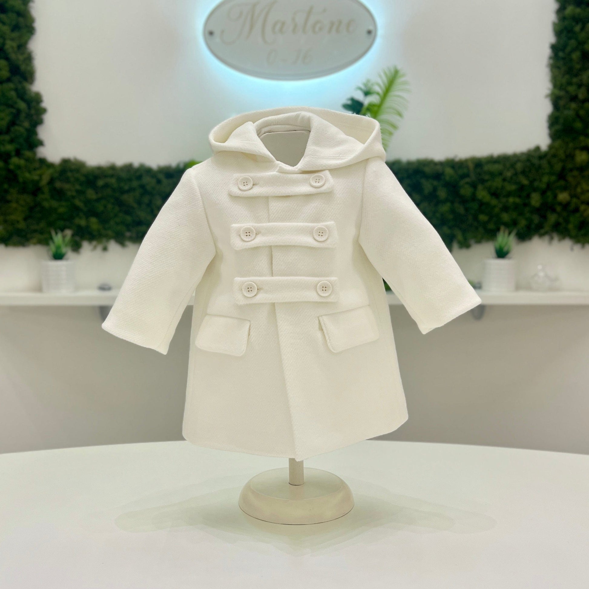 Cappotto doppiopetto in panno con cappuccio e finte tasche frontali.