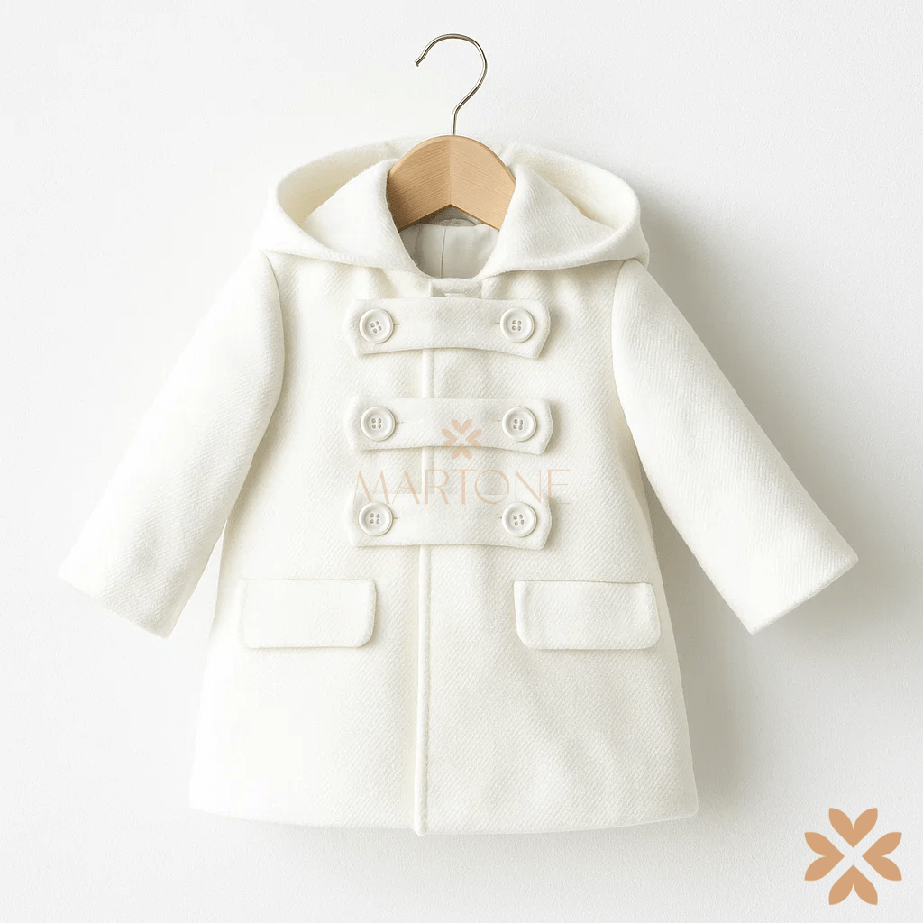 Cappotto in panno dal design raffinato, con cappuccio e chiusura doppiopetto a sei bottoni. Completato da tasche applicate con pattina, offre un mix perfetto di eleganza e praticità, ideale per le occasioni speciali.