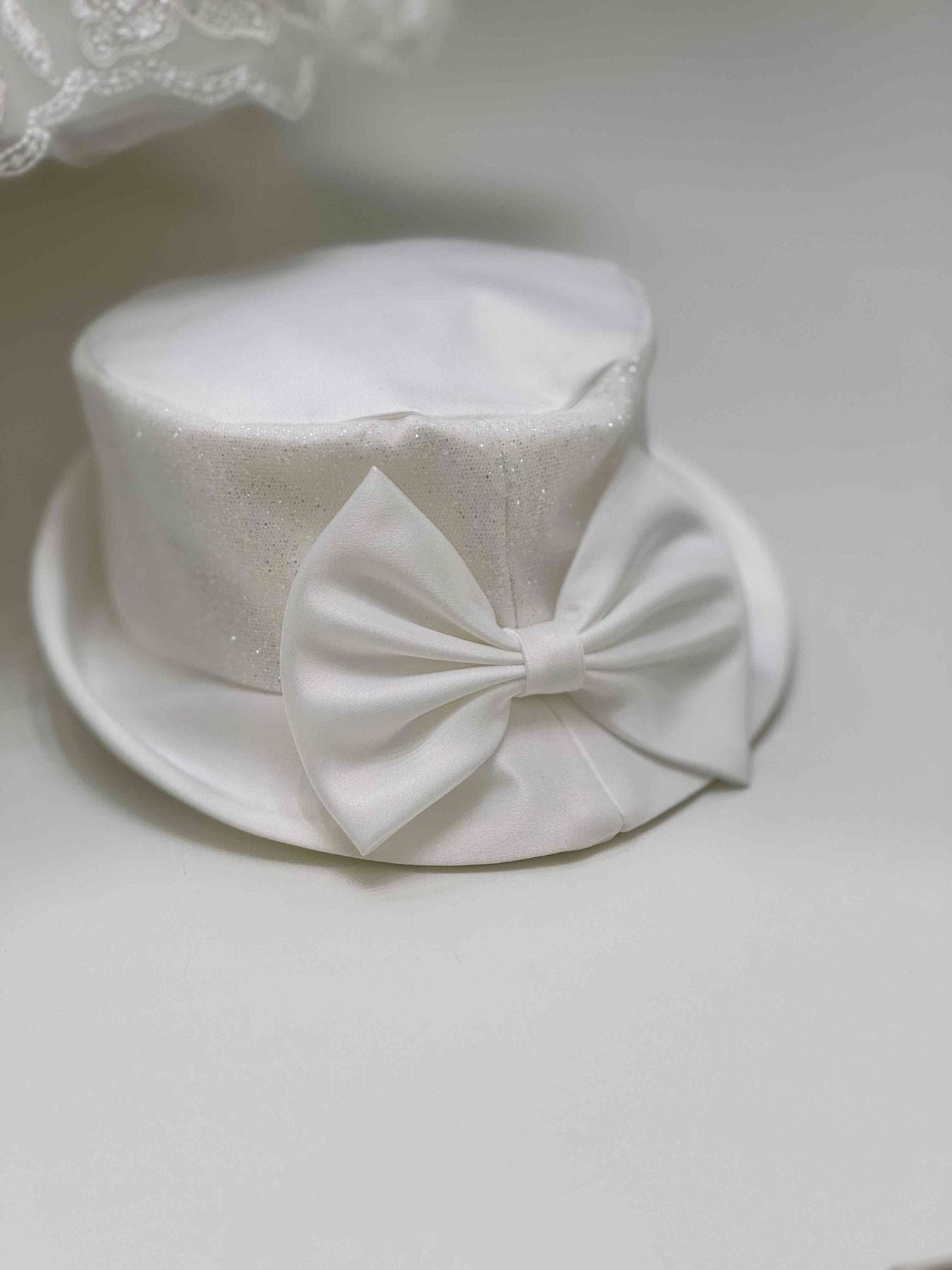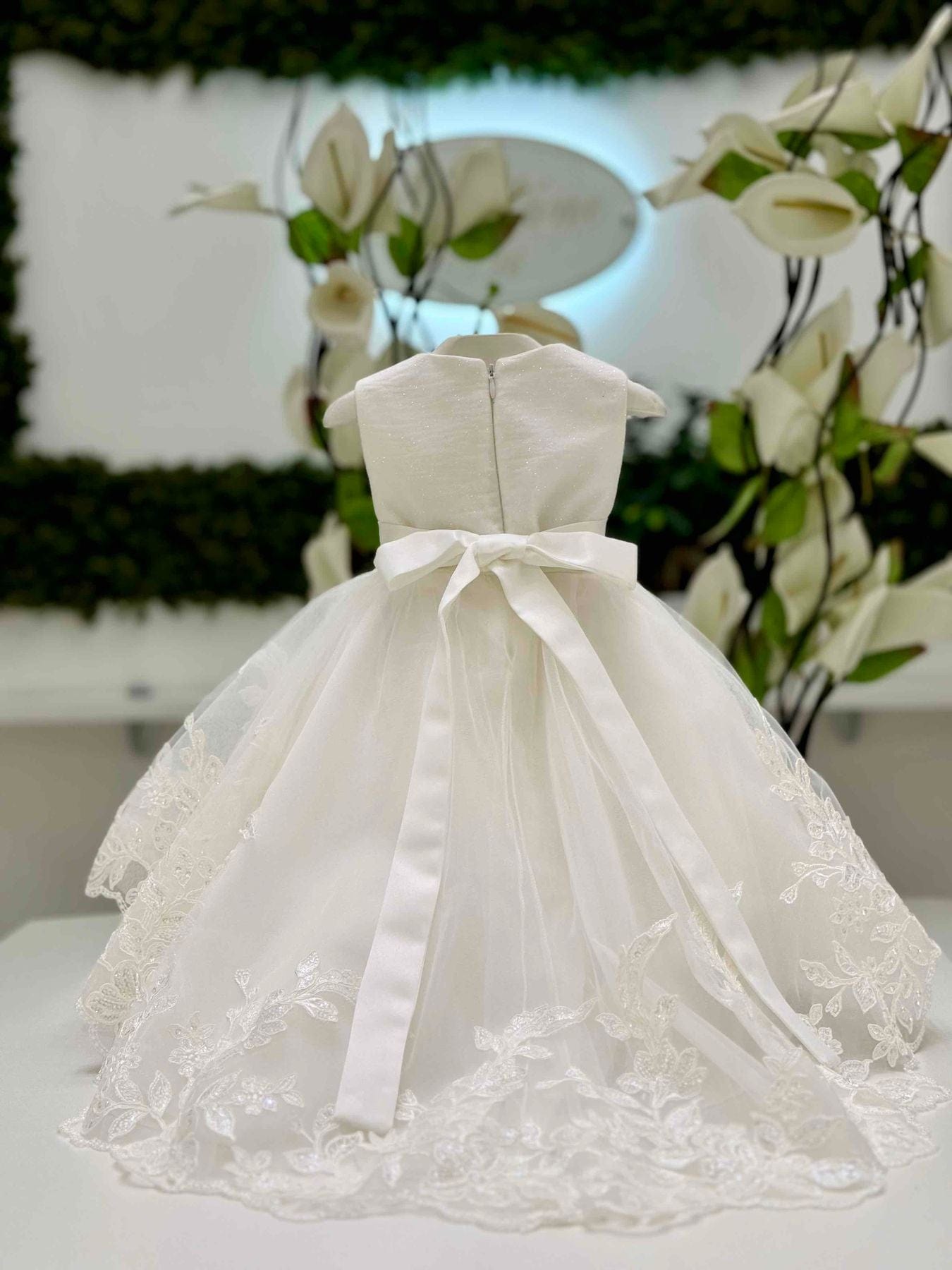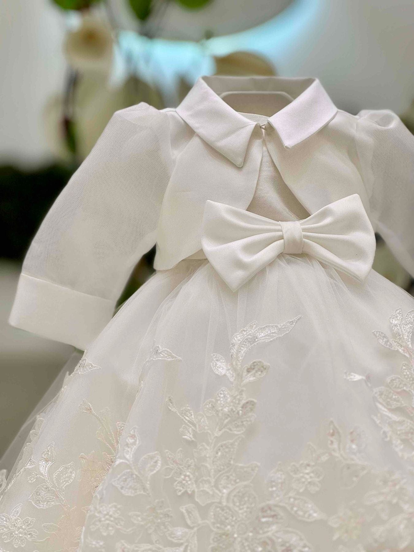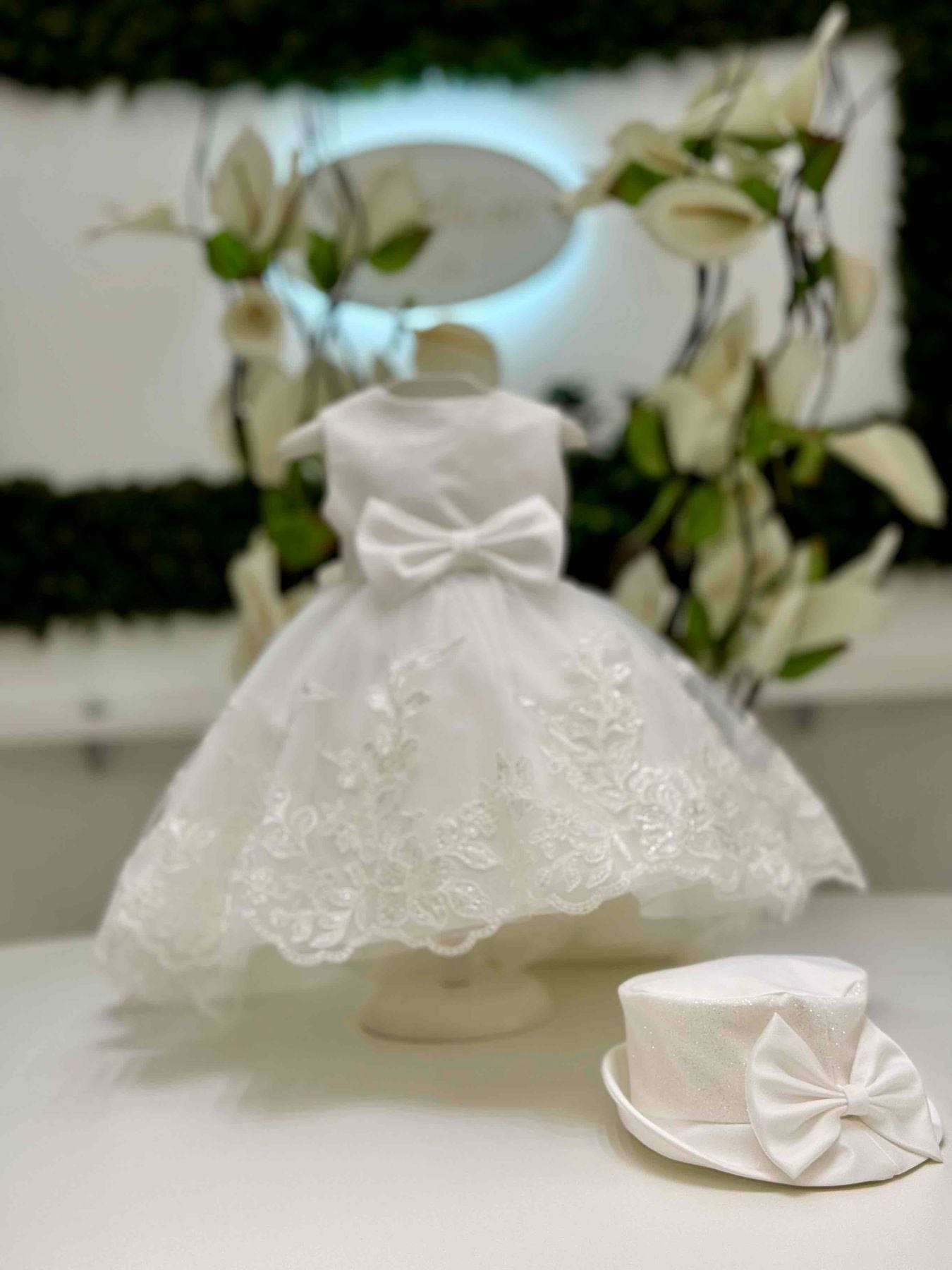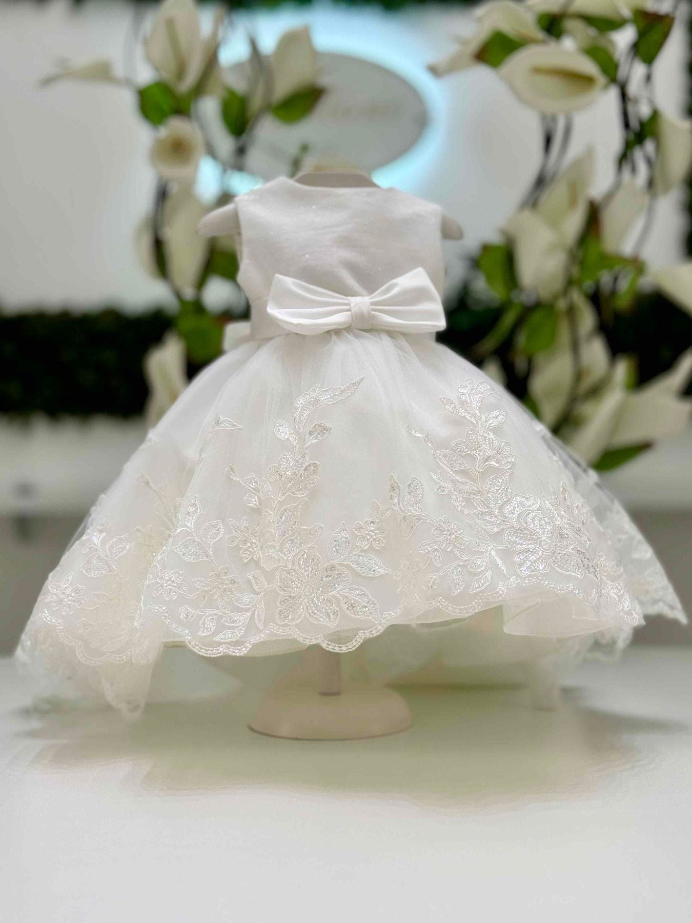Abito battesimale in tulle e ricami in pizzo con coda e fiocco rigido in mikado.