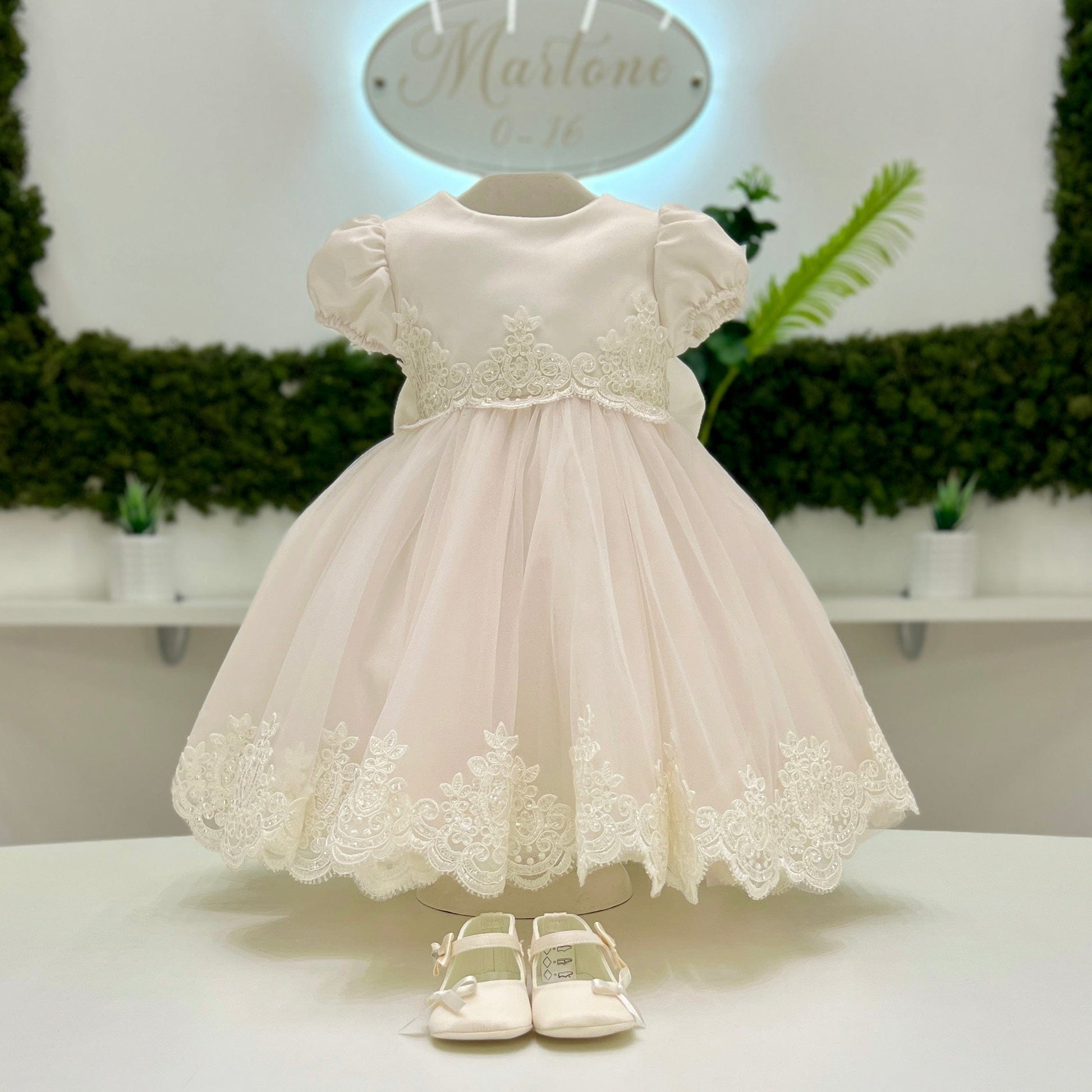 Questo raffinato abito battesimale per neonata, realizzato in tulle, dai toni rosati pallidi, presenta un corpetto liscio foderato e maniche ad aletta. La gonna, decorata con pizzo e paillettes lungo l'orlo e in vita, aggiunge un tocco di eleganza. La chiusura posteriore con bottoncini è completata da un morbido fiocco che arricchisce il retro dell'abito con delicatezza.