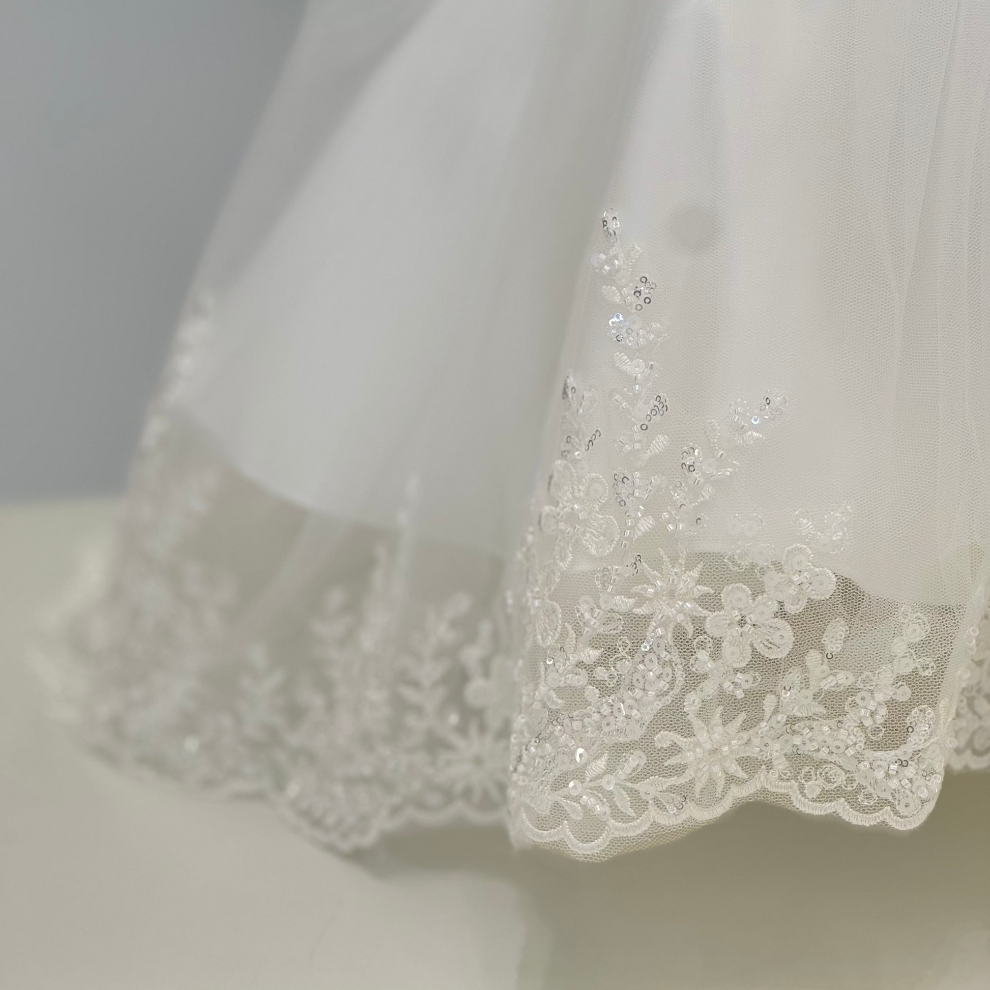 Questo sofisticato abito battesimale per neonata, impreziosito da una coda, combina un corpetto liscio in mikado con maniche a sbuffo per un look raffinato. La gonna in tulle, foderata per garantire comfort, è finemente rifinita sull'orlo con pizzo arricchito da canottiglie. In vita, una cintura liscia avvolge delicatamente la figura, mentre un elegante fiocco rigido sul retro completa l'abito con un tocco distintivo.