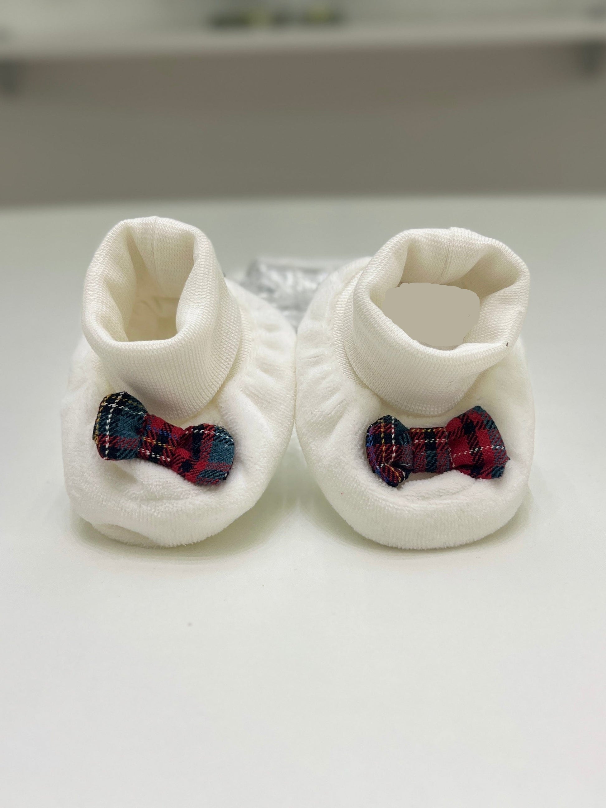 Queste scarpette per neonato, realizzate in ciniglia, combinano il colore bianco con graziosi fiocchetti in tartan.