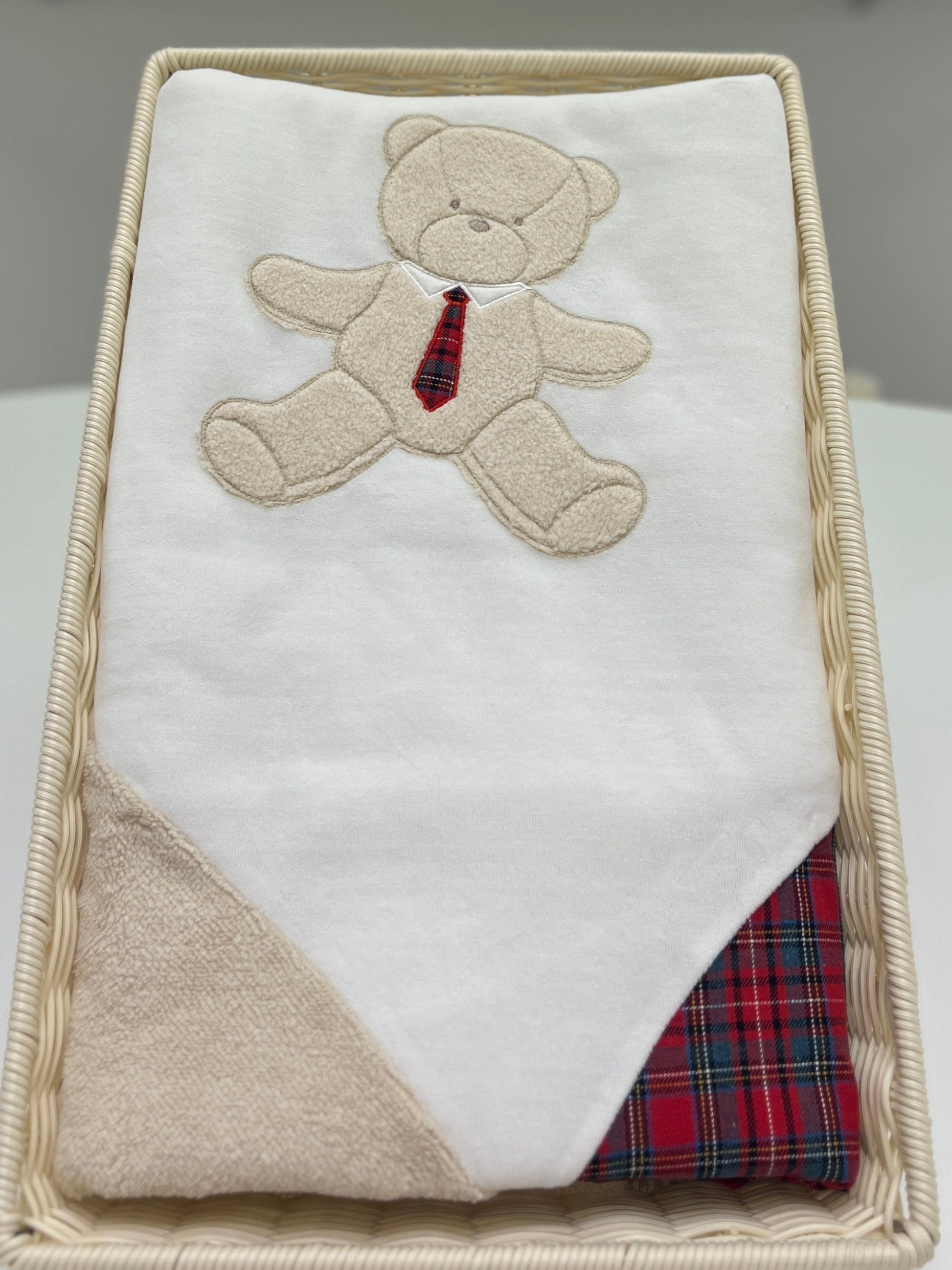 Coperta in ciniglia imbottita color panna con un orsetto decorativo al centro e sul retro è presente un motivo in tartan.