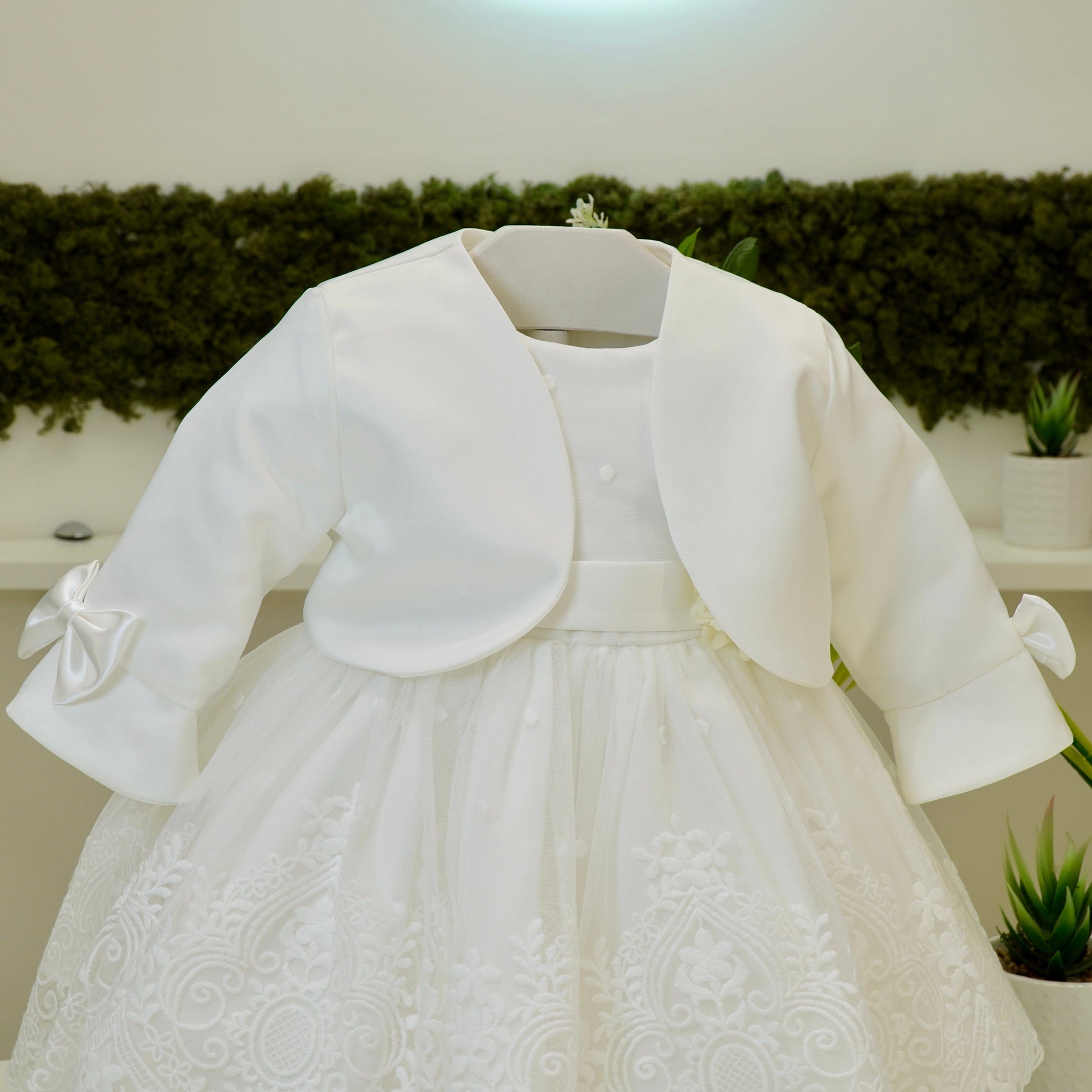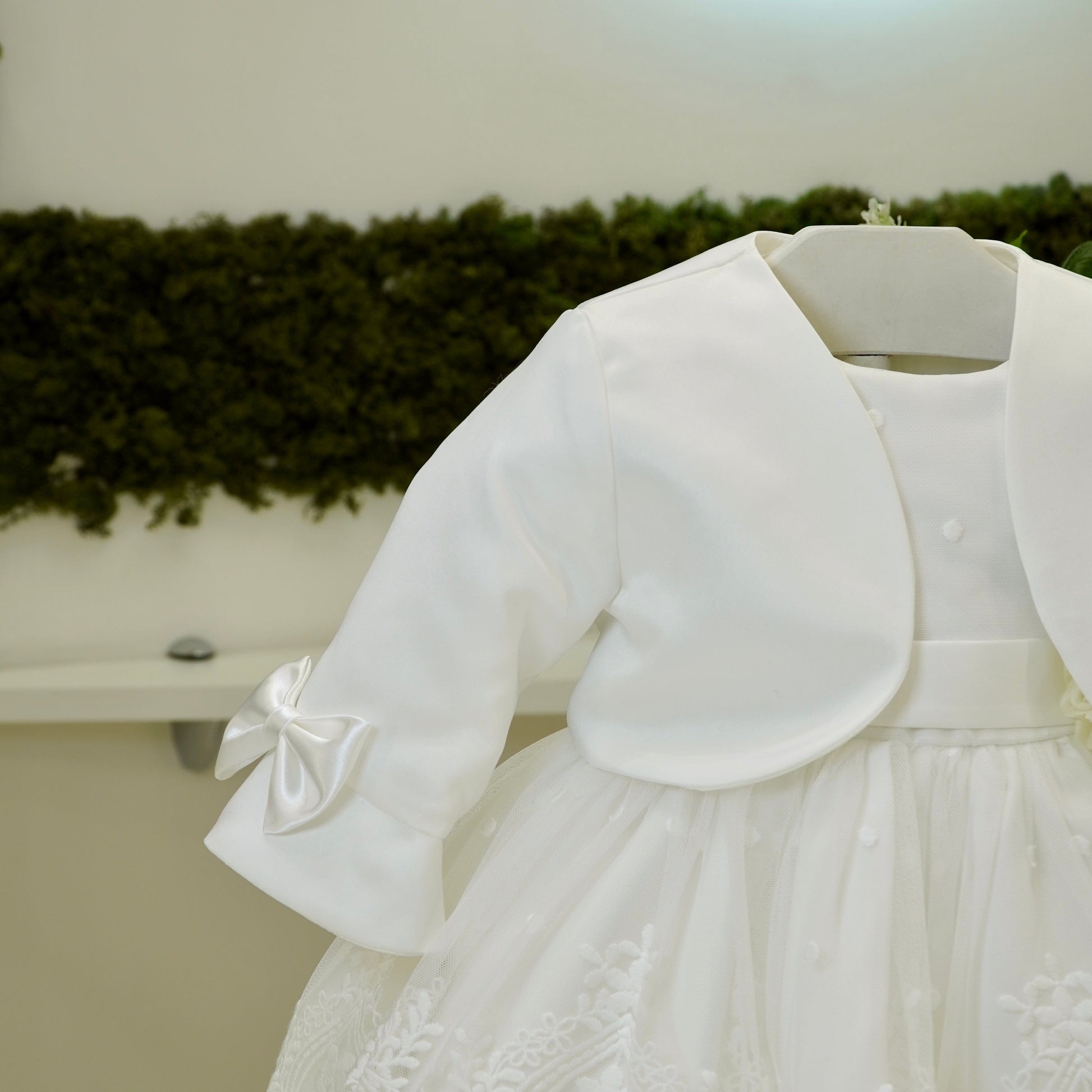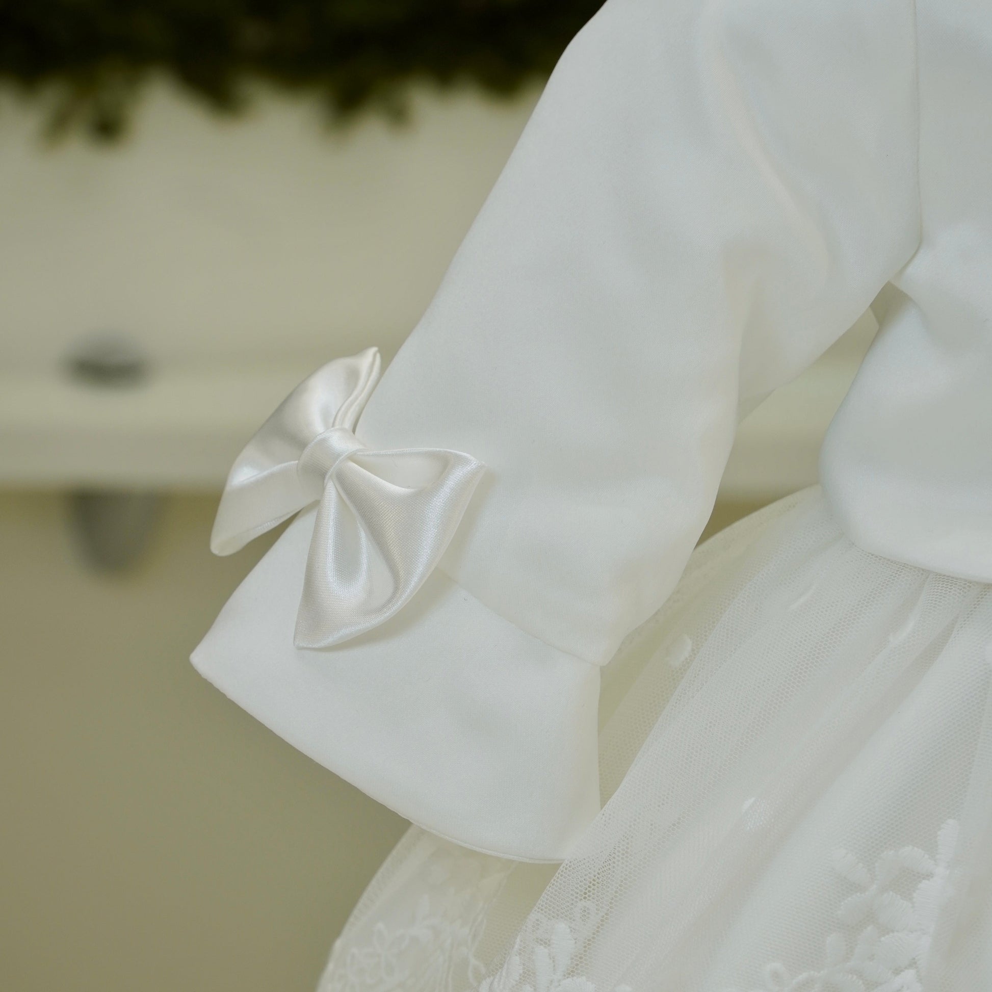 Bolerino in mikado con fiocchi laterali in raso sulla manica.