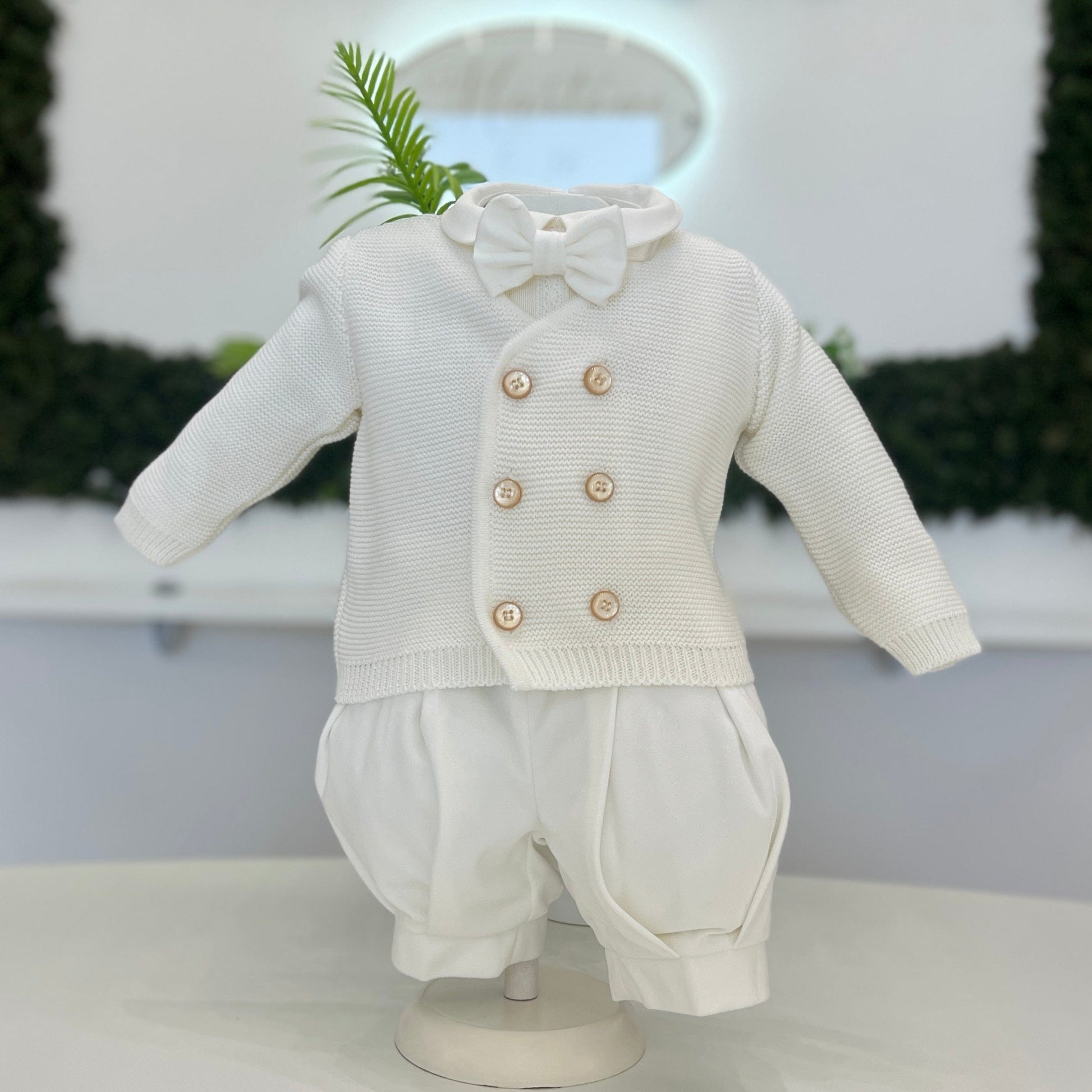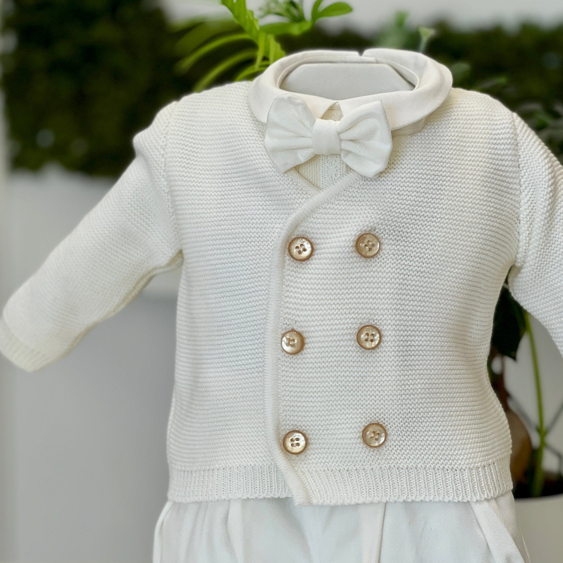 Cardigan battesimale per bimbo realizzato in maglia a punto riso, con taglio incrociato e chiusura a doppio petto. Il modello è rifinito con bottoni in tono leggermente a contrasto che donano un tocco elegante e raffinato. Morbido e confortevole, completa con stile l’outfit cerimonia rendendolo adatto anche ai momenti più freschi della giornata.