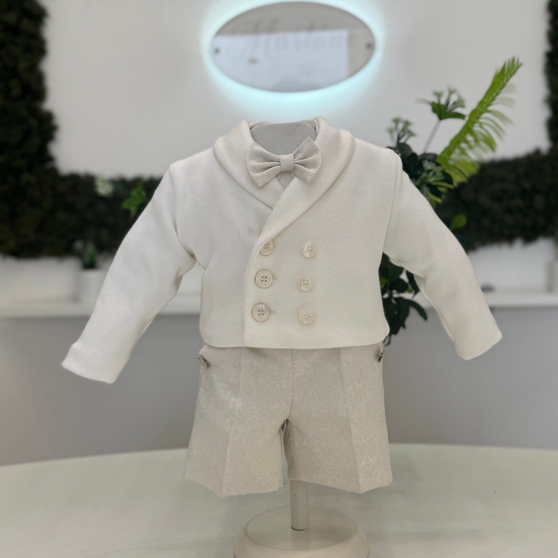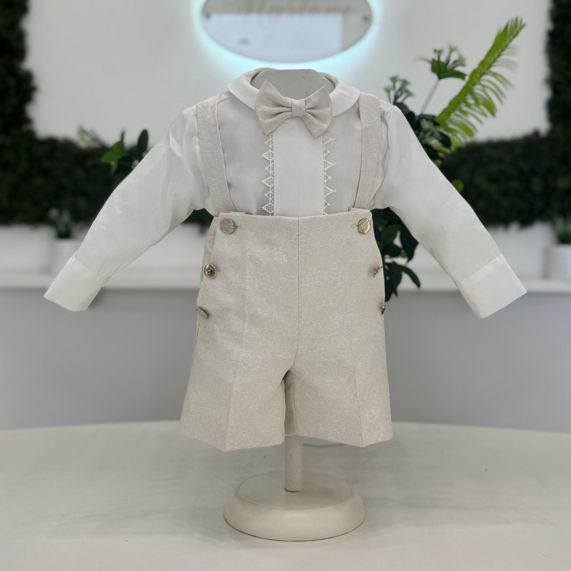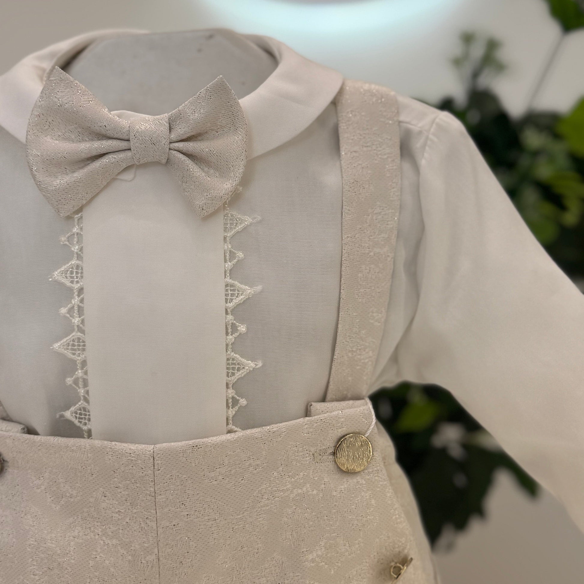 Completo da battesimo con pantaloncino corto in tessuto jacquard panna con venature oro, impreziosito da bottoni dorati e bretelle applicate. La camicia in puro cotone presenta un inserto ricamato sul davanti e colletto arrotondato, abbinata a papillon coordinato. Un look fresco e raffinato, pensato per le cerimonie più speciali.