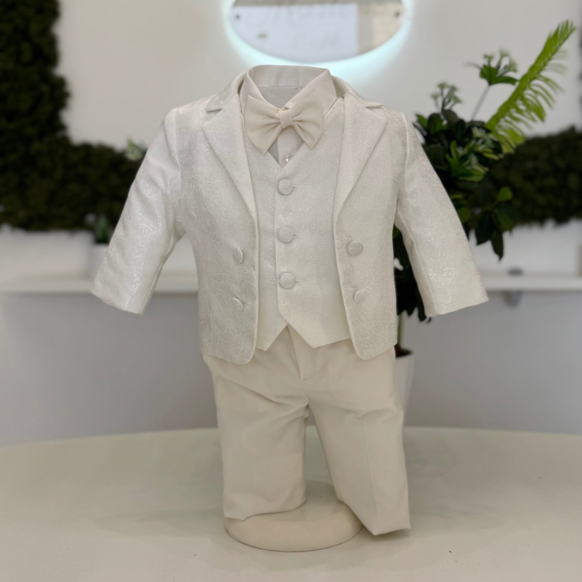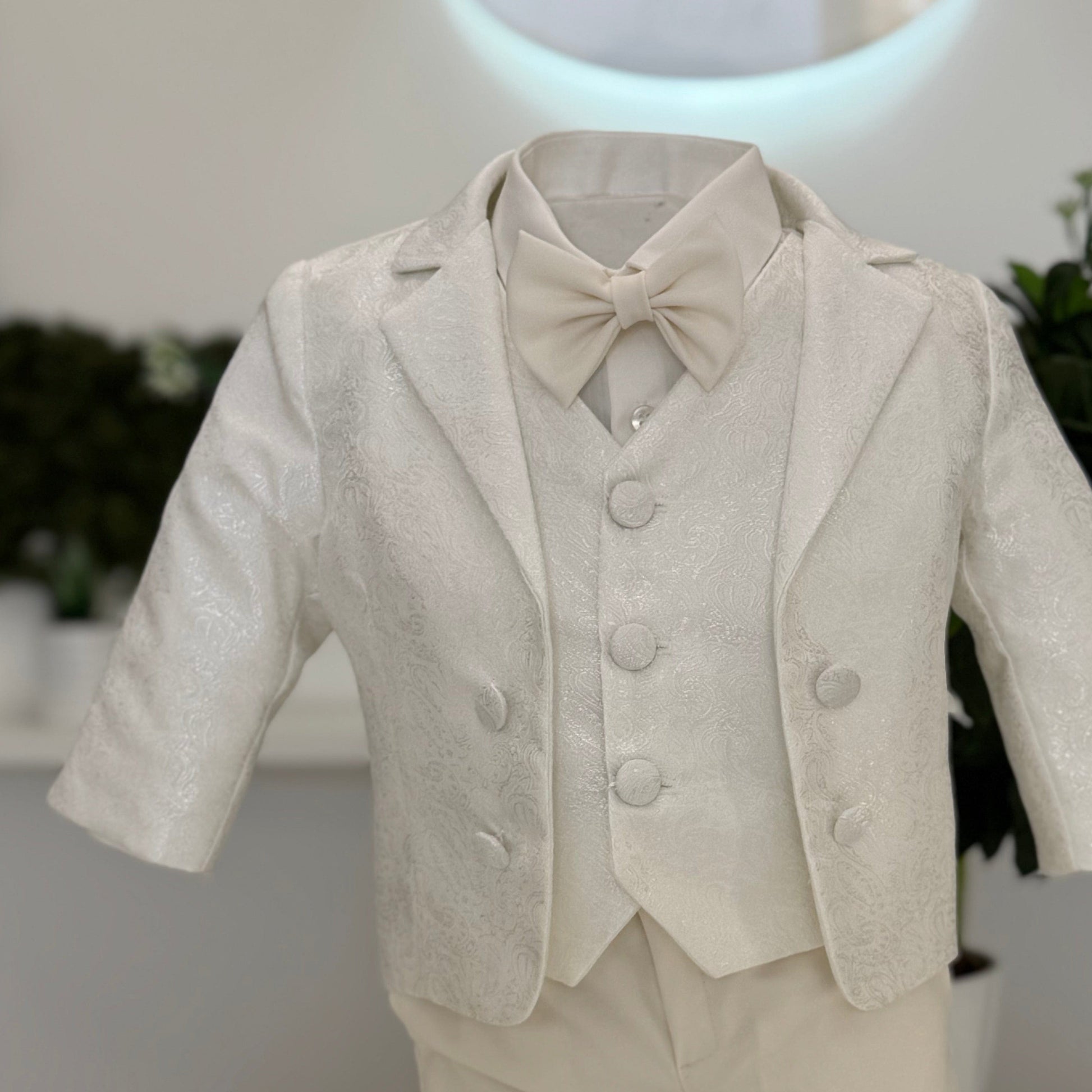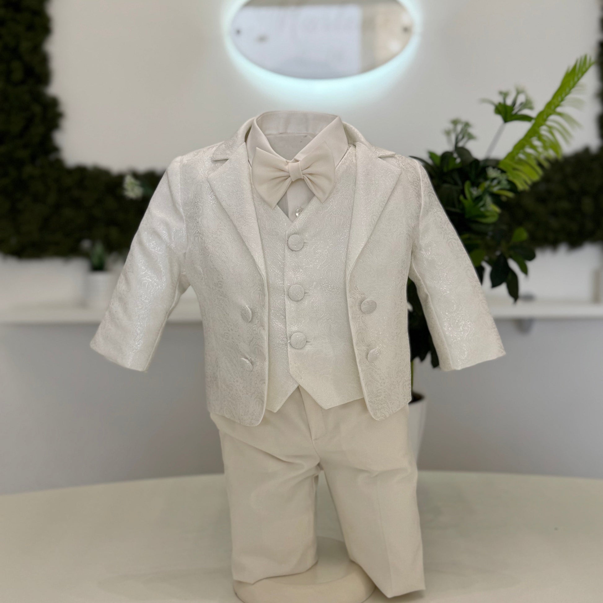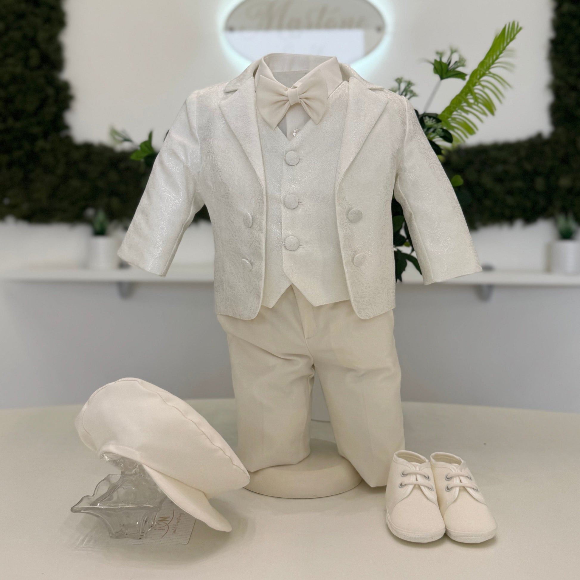 Completo da battesimo in tessuto damascato bianco, composto da giacca monopetto con bottoni rivestiti e gilet coordinato. Il motivo jacquard è impreziosito da riflessi iridescenti che donano una luminosità raffinata, esaltata dal papillon abbinato. Camicia in cotone e pantalone liscio. Un outfit cerimoniale dallo stile impeccabile e senza tempo.