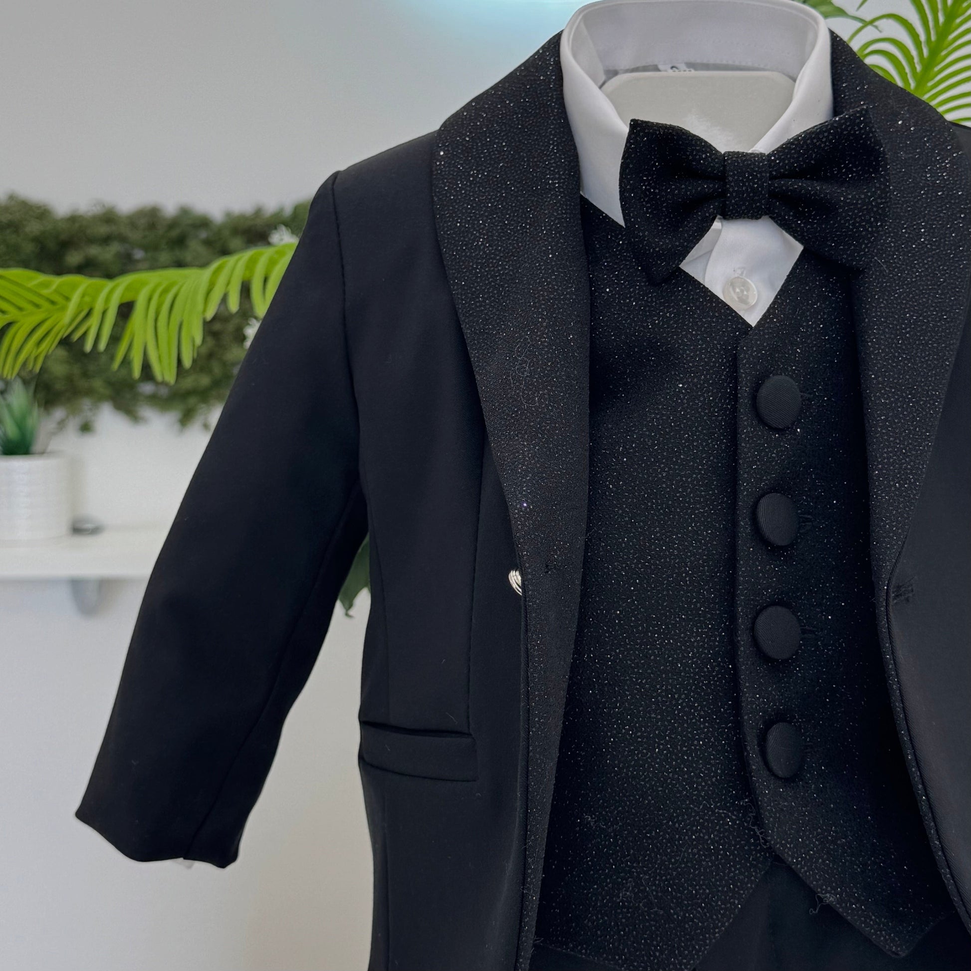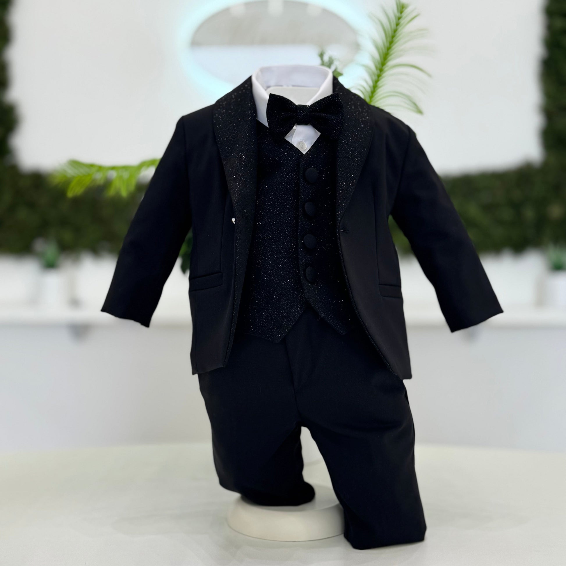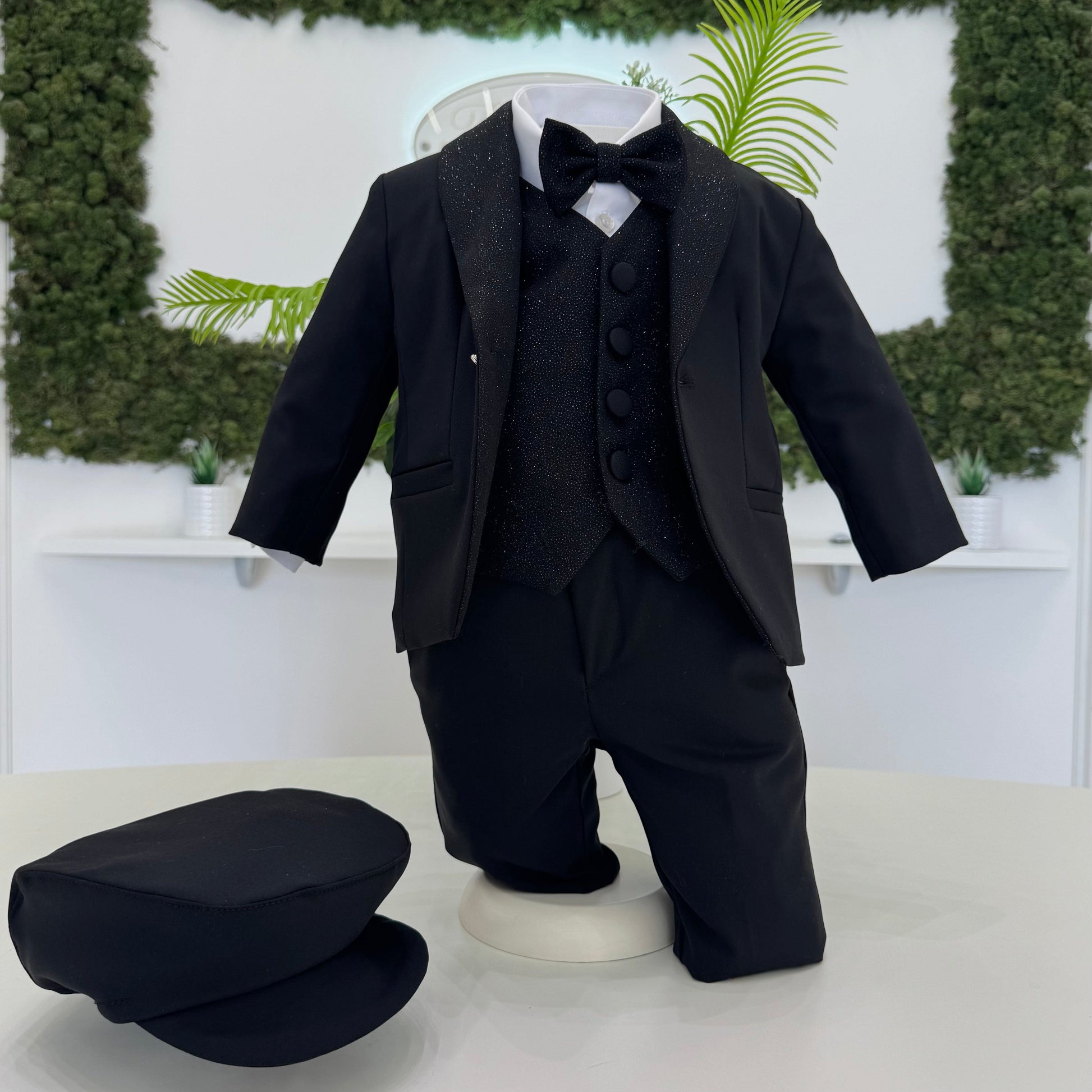 Smoking da battesimo nero, composto da giacca monopetto con revers a riflessi iridescenti e gilet coordinato con bottoni rivestiti. Papillon in tessuto abbinato, camicia bianca in cotone e pantalone liscio completano l’ensemble. Il cappellino coordinato aggiunge un tocco di stile unico, per un look elegante e memorabile.