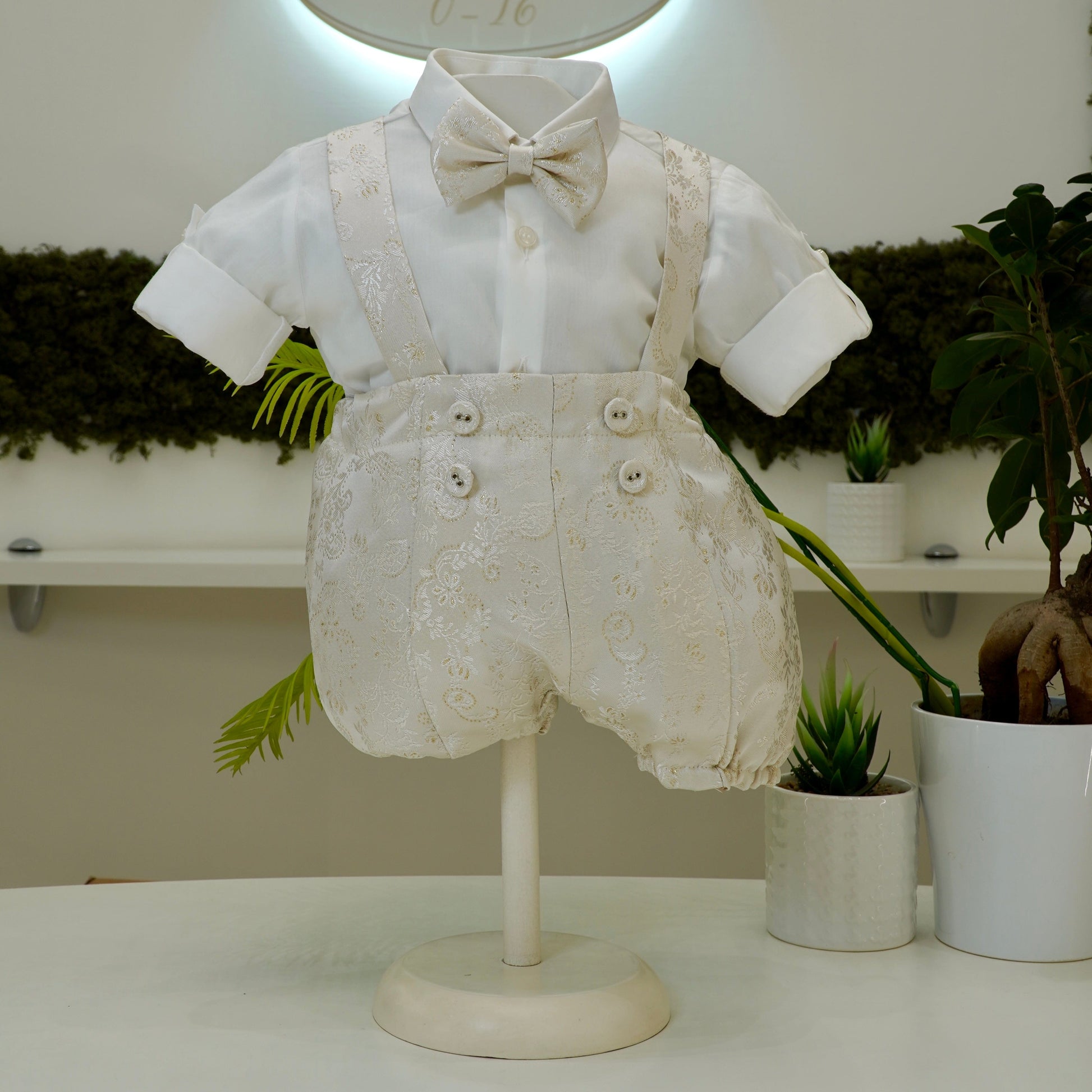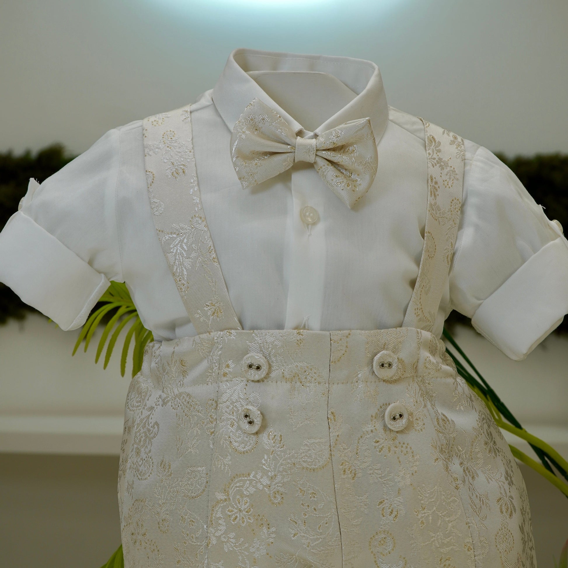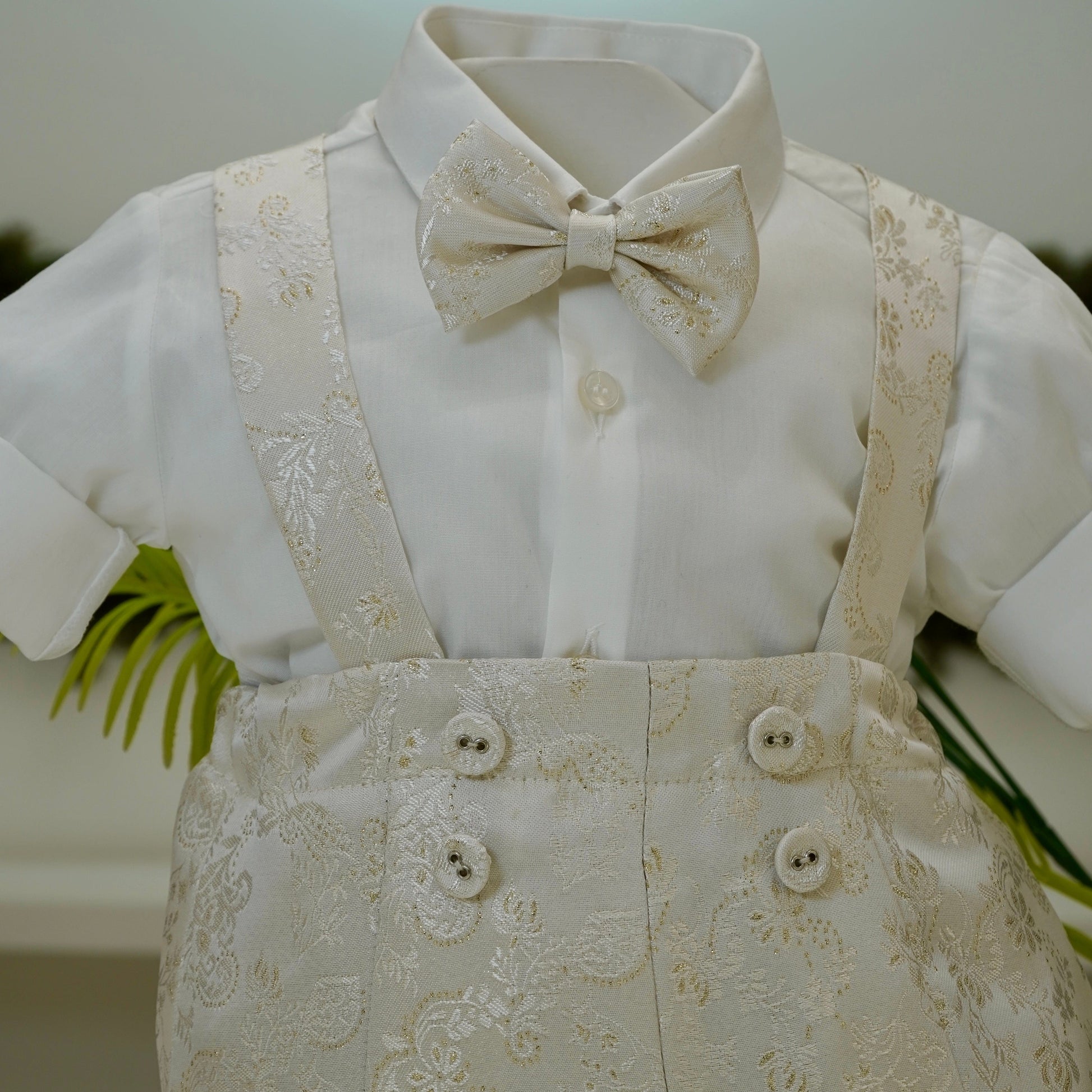 Abito battesimale elegante sui toni dell'oro composto da pagliaccetto con bretelle e bottoni frontali in damascato con punti luce, camicia in cotone classica con risvolti e papillon con gancio regolabile.