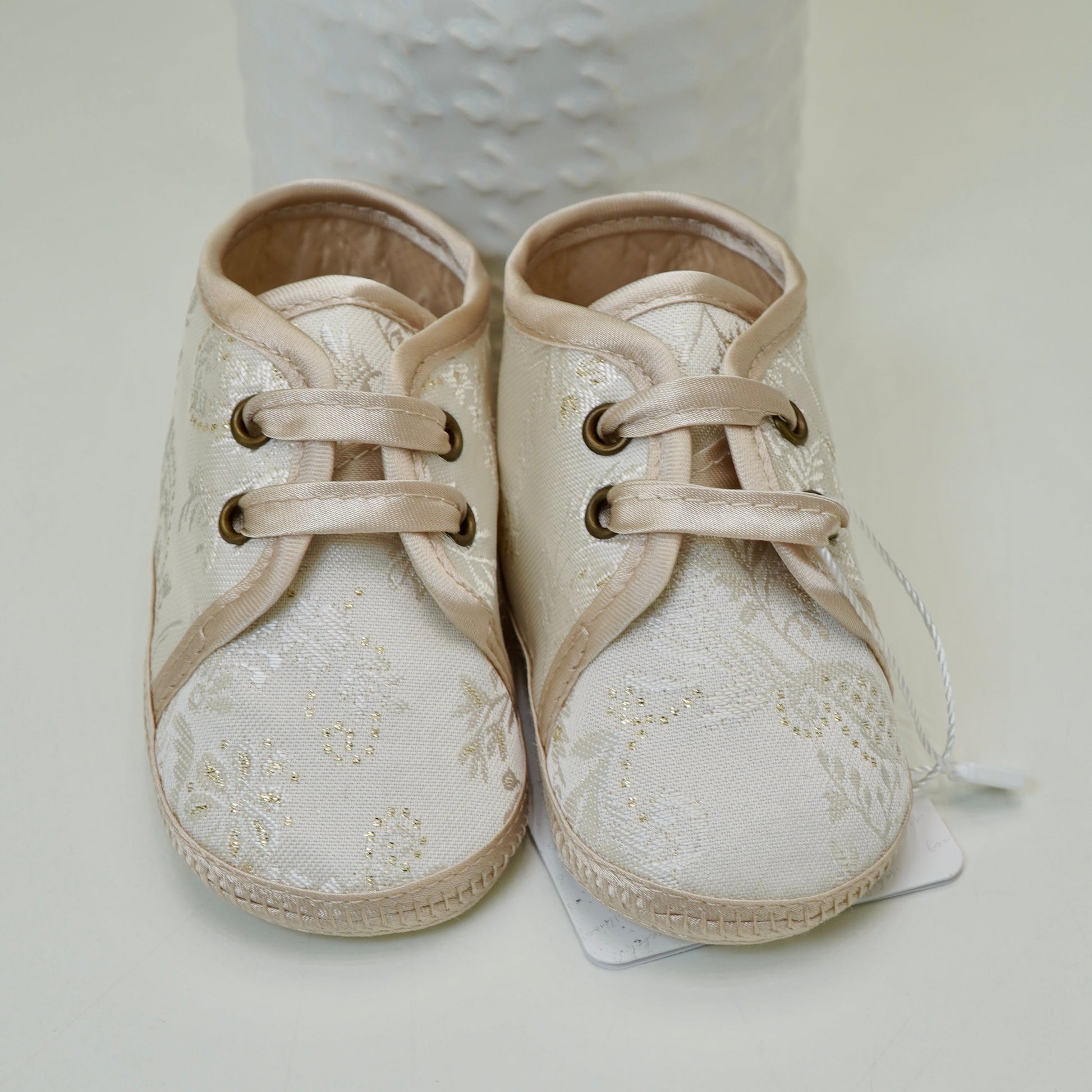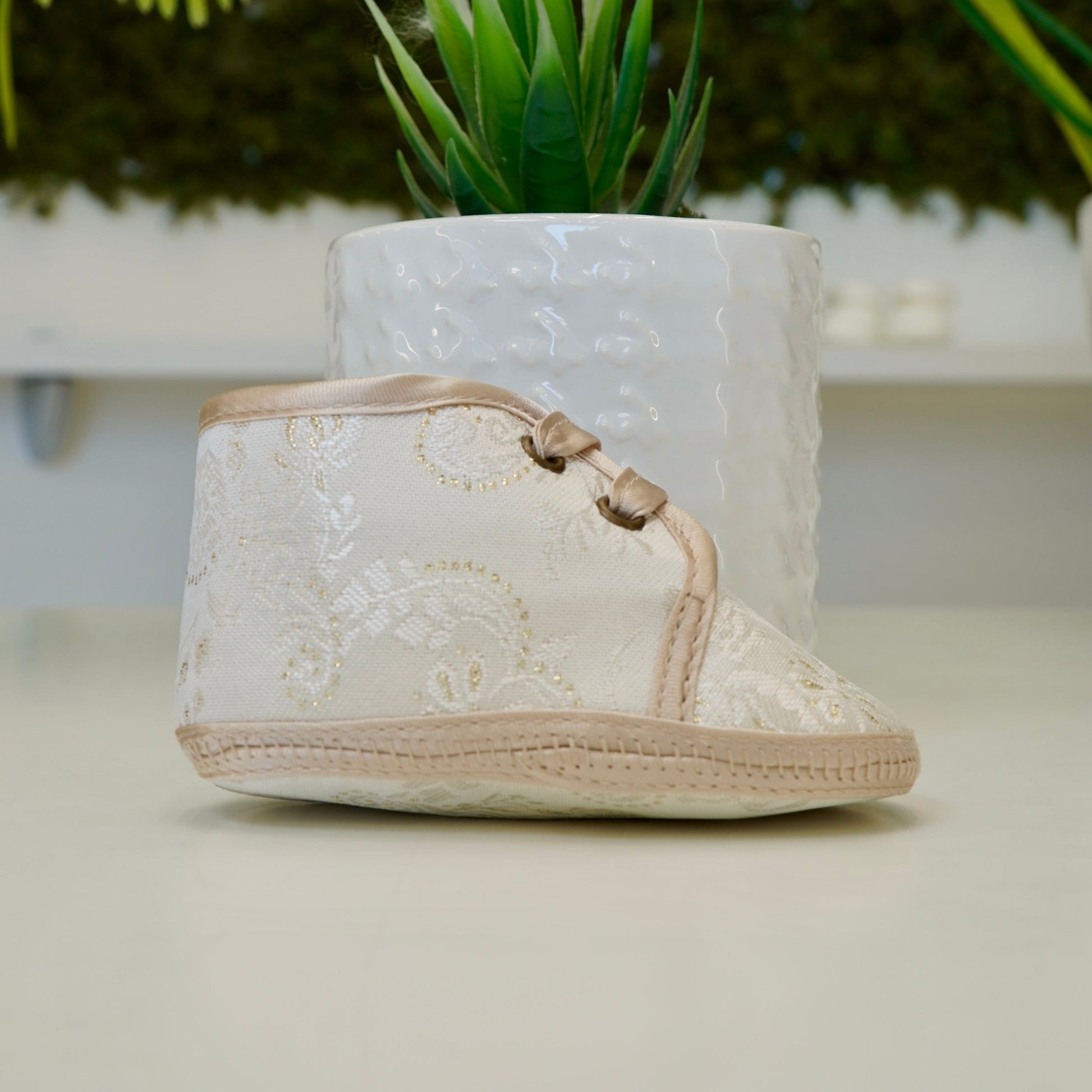Scarpina battesimale in tessuto damascato da culla per neonato, un accessorio elegante e studiato nei minimi dettagli per completare il look del tuo piccolo nel giorno del suo battesimo.