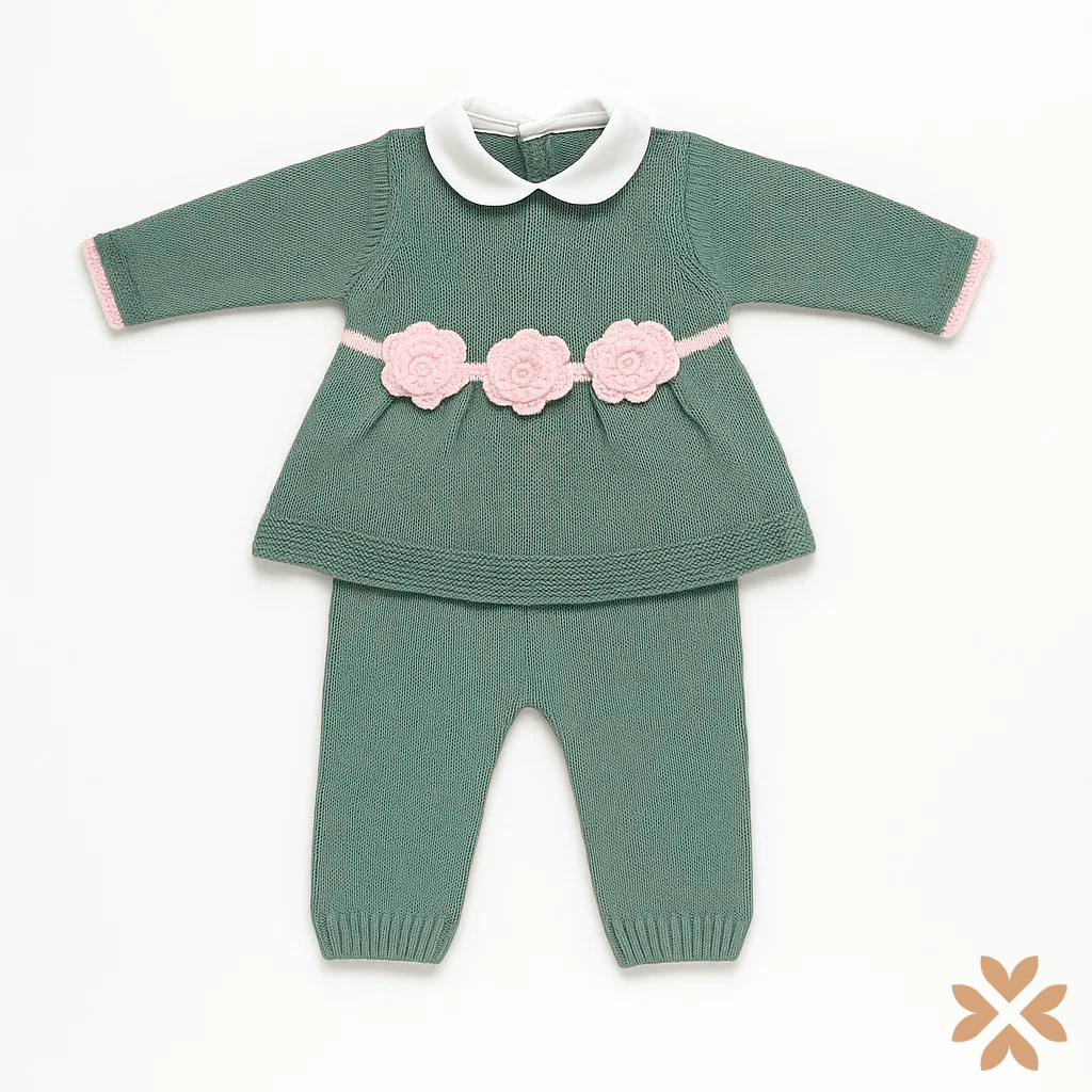 Completo neonata in maglia verde salvia con colletto bianco, applicazioni floreali rosa in vita e pantalone coordinato con polsino elasticizzato.