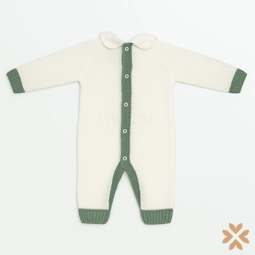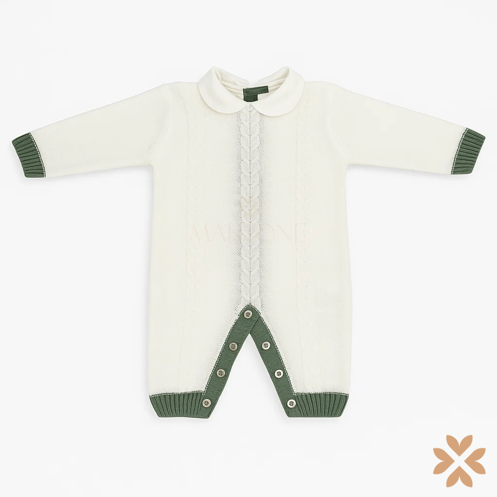 Tutina neonat0 in maglia panna con colletto bianco, lavorazione a trecce sul davanti e rifiniture verde salvia su polsini e fondo gamba. Apertura con bottoncini sul retro e al cavallo per un pratico cambio.