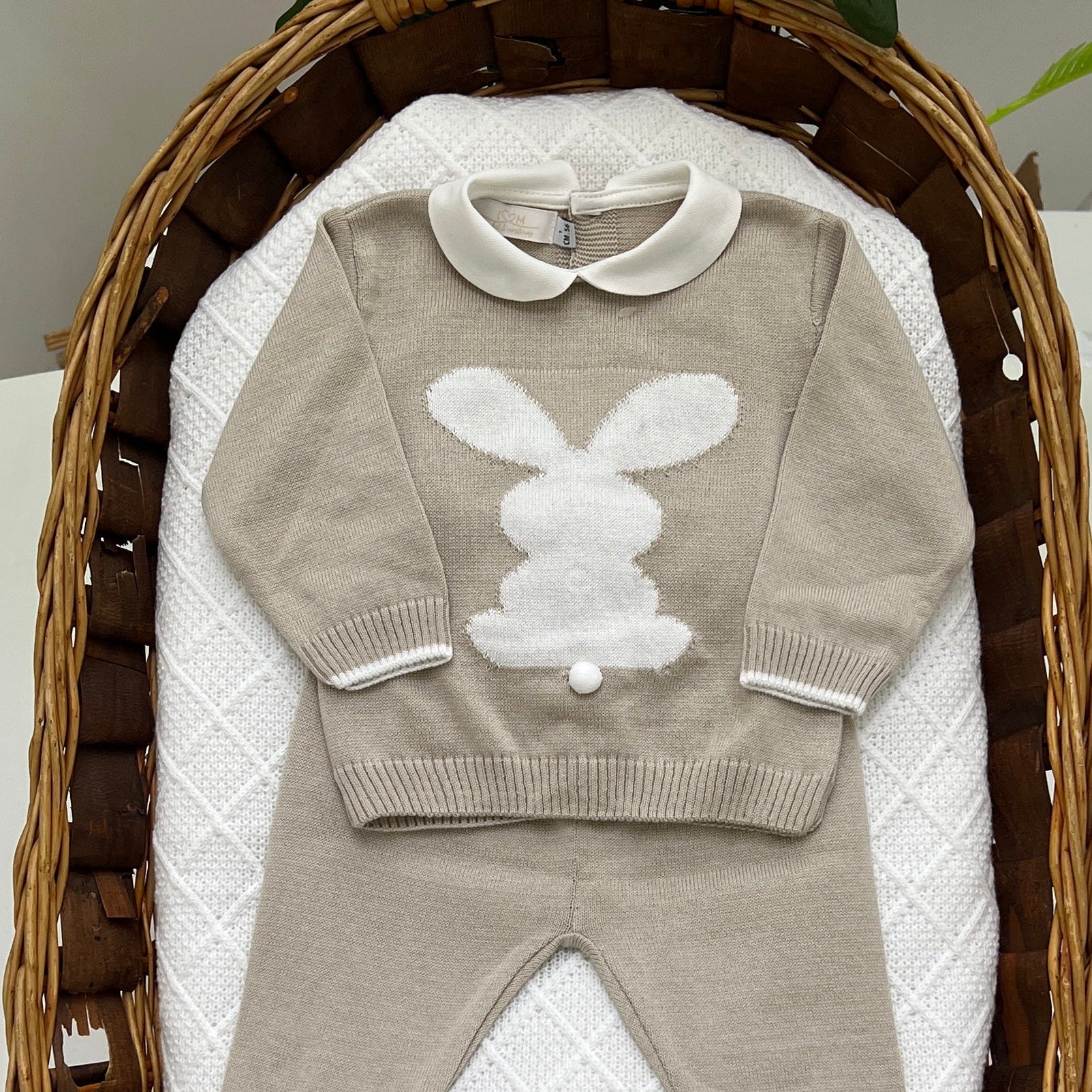 Tutina spezzata per clinica in filo di cotone, con colletto in piquet e ricamo di coniglietto sulla maglia. Un capo delicato e confortevole, perfetto per i primi giorni del neonato.