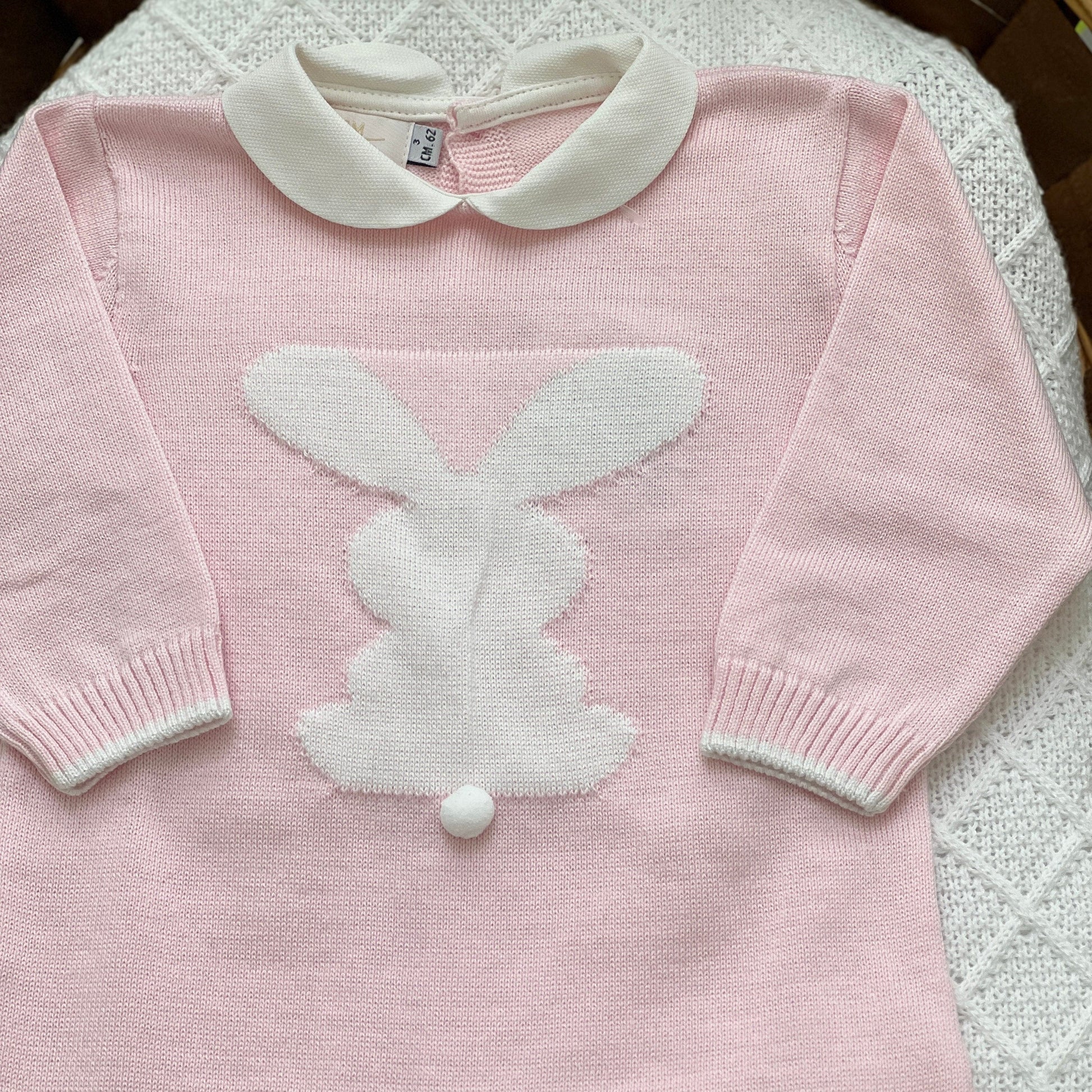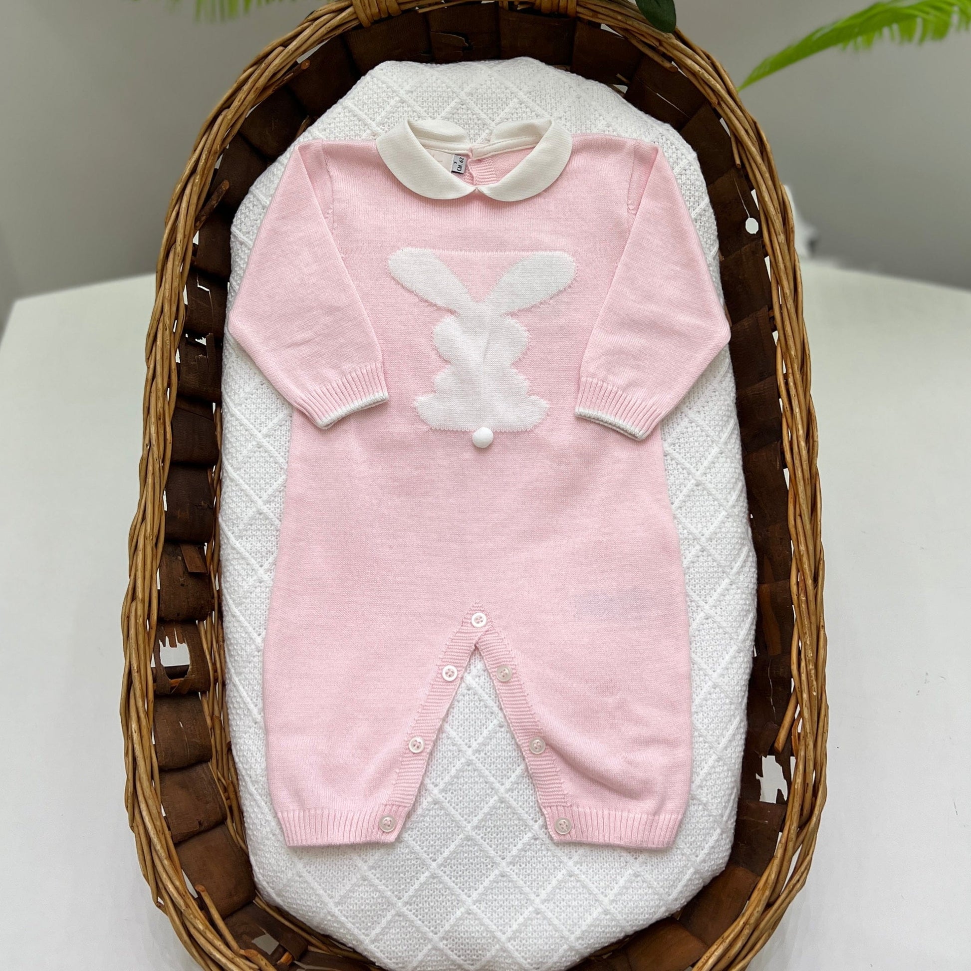 Tutina intera in filo di cotone rosa, con colletto in piquet e coniglietto raffigurato sul davanti. Un capo raffinato e confortevole, ideale per i primi giorni del neonato.