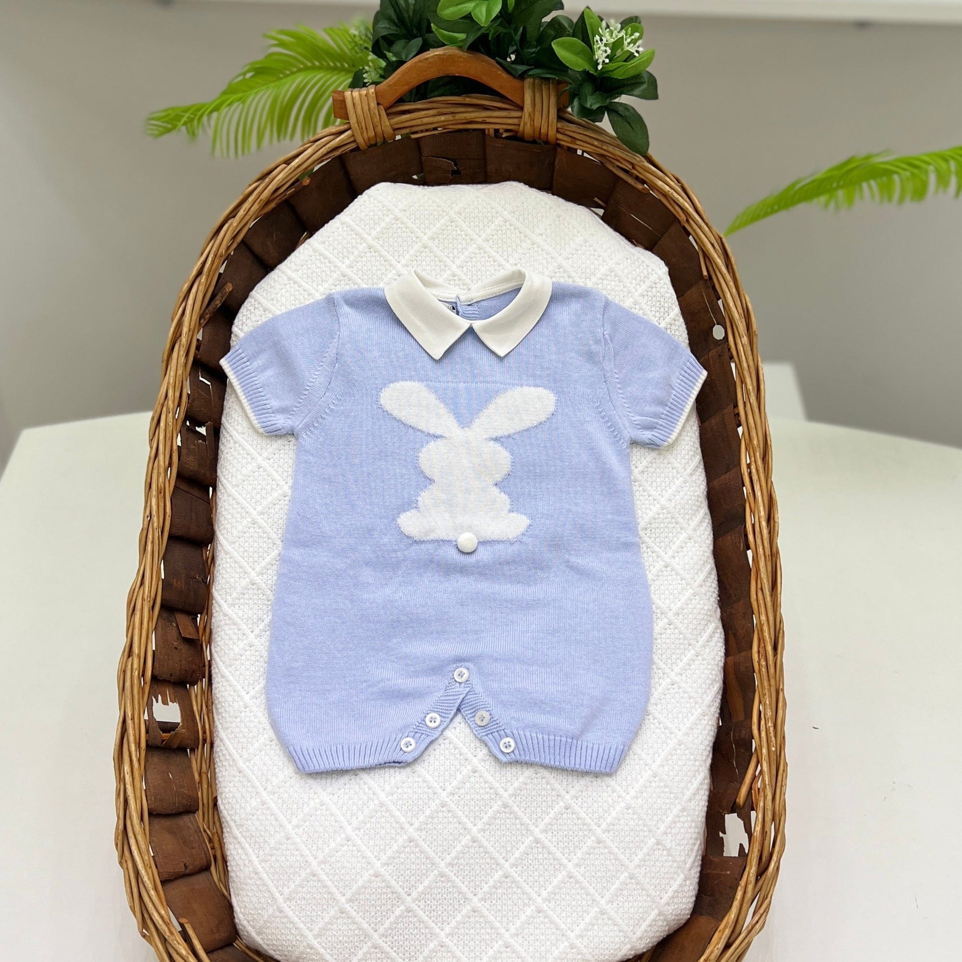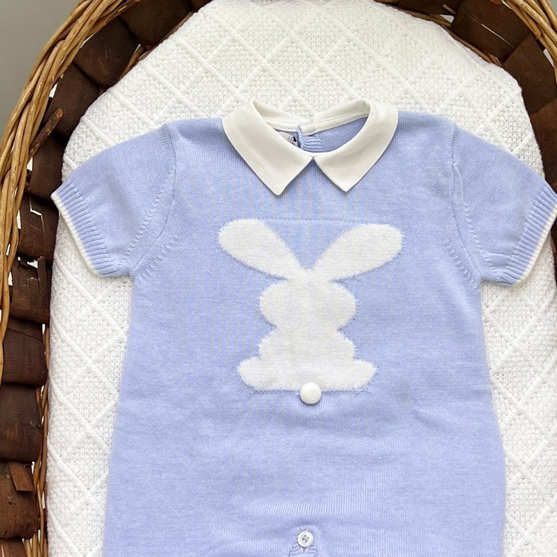 Pagliaccetto in filo di cotone celeste, con colletto in piquet e coniglietto raffigurato sul davanti. Fresco e raffinato, perfetto per i primi giorni del neonato.