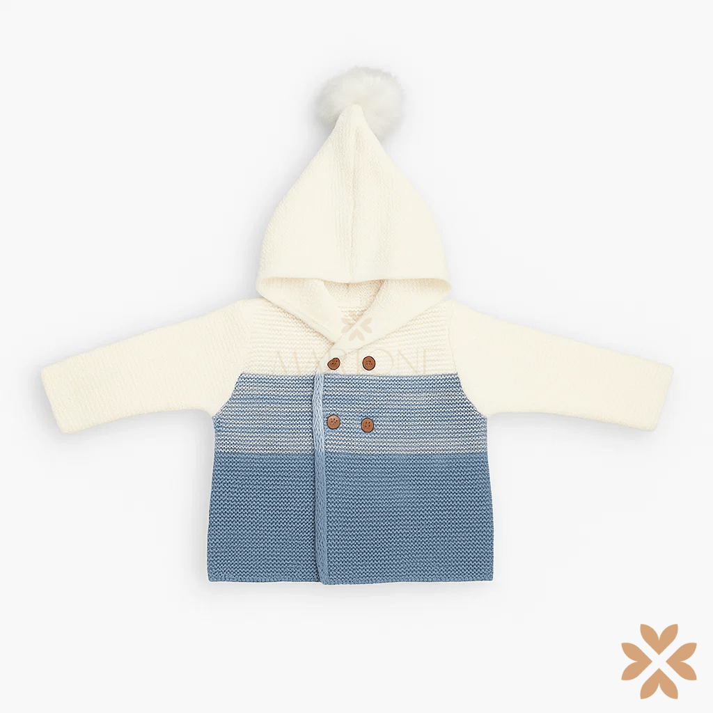 Cappottino in maglia per neonato, realizzato in morbido filato bicolore panna e azzurro. Presenta cappuccio con pompon in eco pelliccia, chiusura laterale con bottoni in legno e lavorazione a punto riso nella parte inferiore. Un capo pratico e caldo, perfetto per le giornate più fresche.