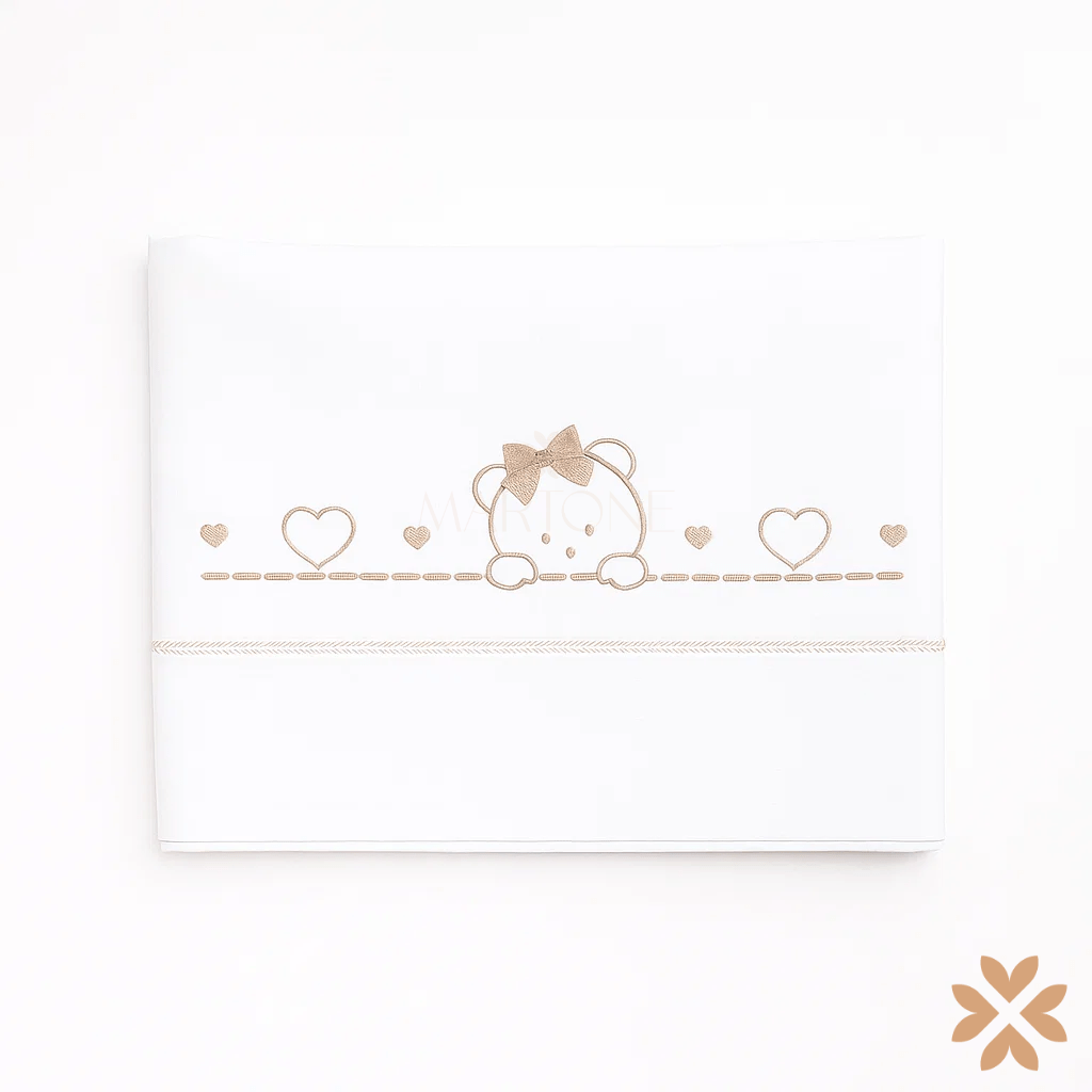 Set lenzuola carrozzina in cotone bianco composto da lenzuolo sopra con ricamo orsetto e cuori beige, lenzuolo sotto e federa coordinata.