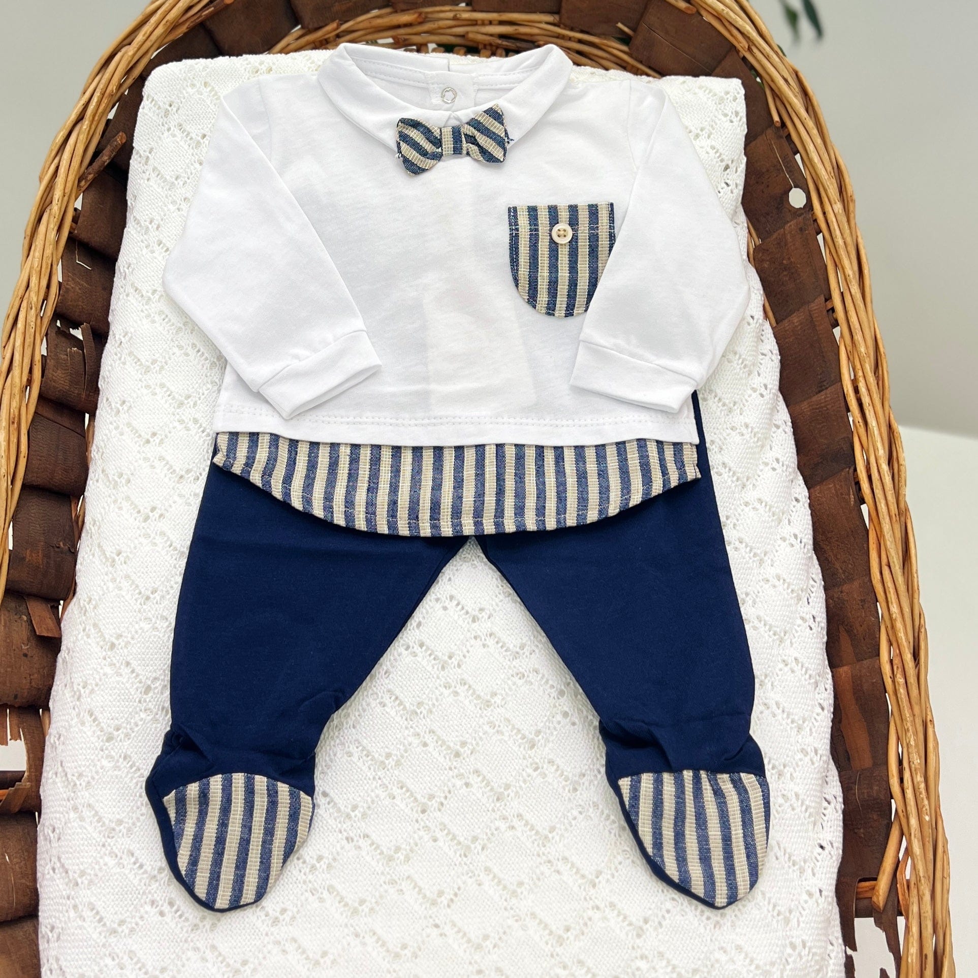 Tutina spezzata neonato in cotone jersey con fantasia a righe, arricchita da papillon e taschino. Un capo pratico ed elegante per il tuo piccolo.