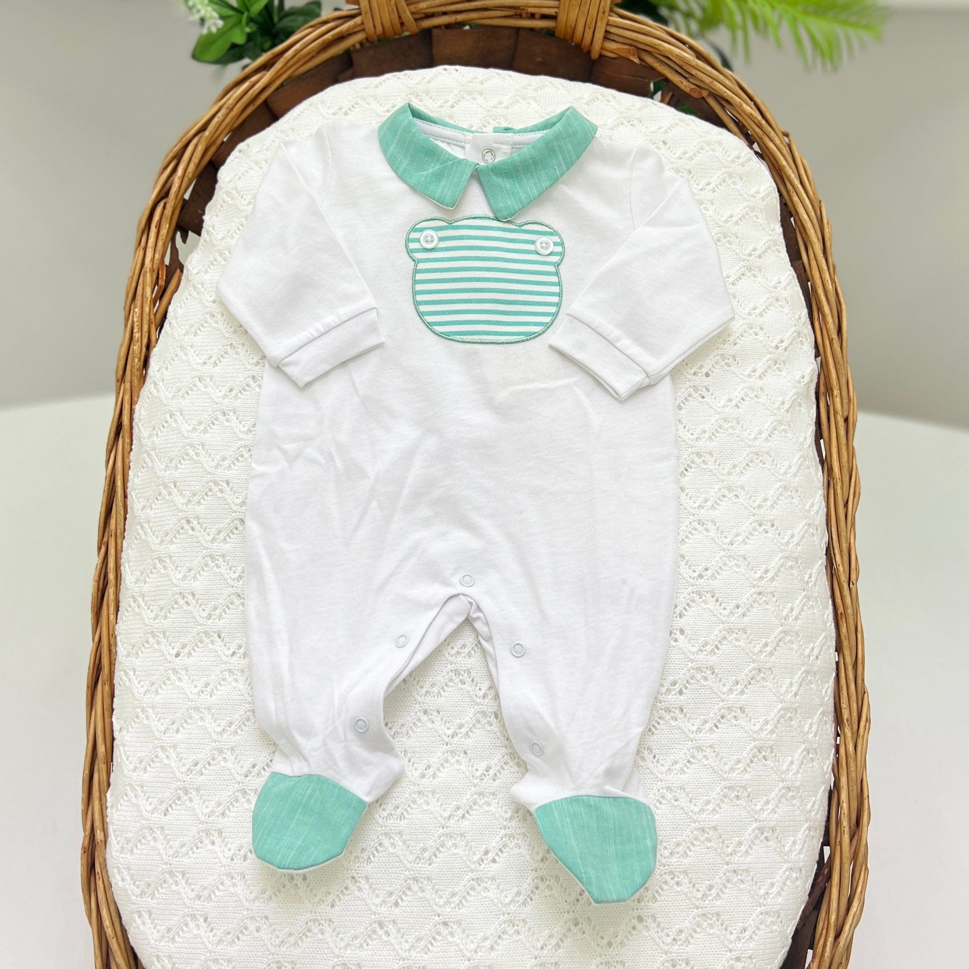 Tutina intera in cotone jersey con fantasia a righe verde acqua. Morbida e pratica, ideale per il comfort quotidiano del neonato.