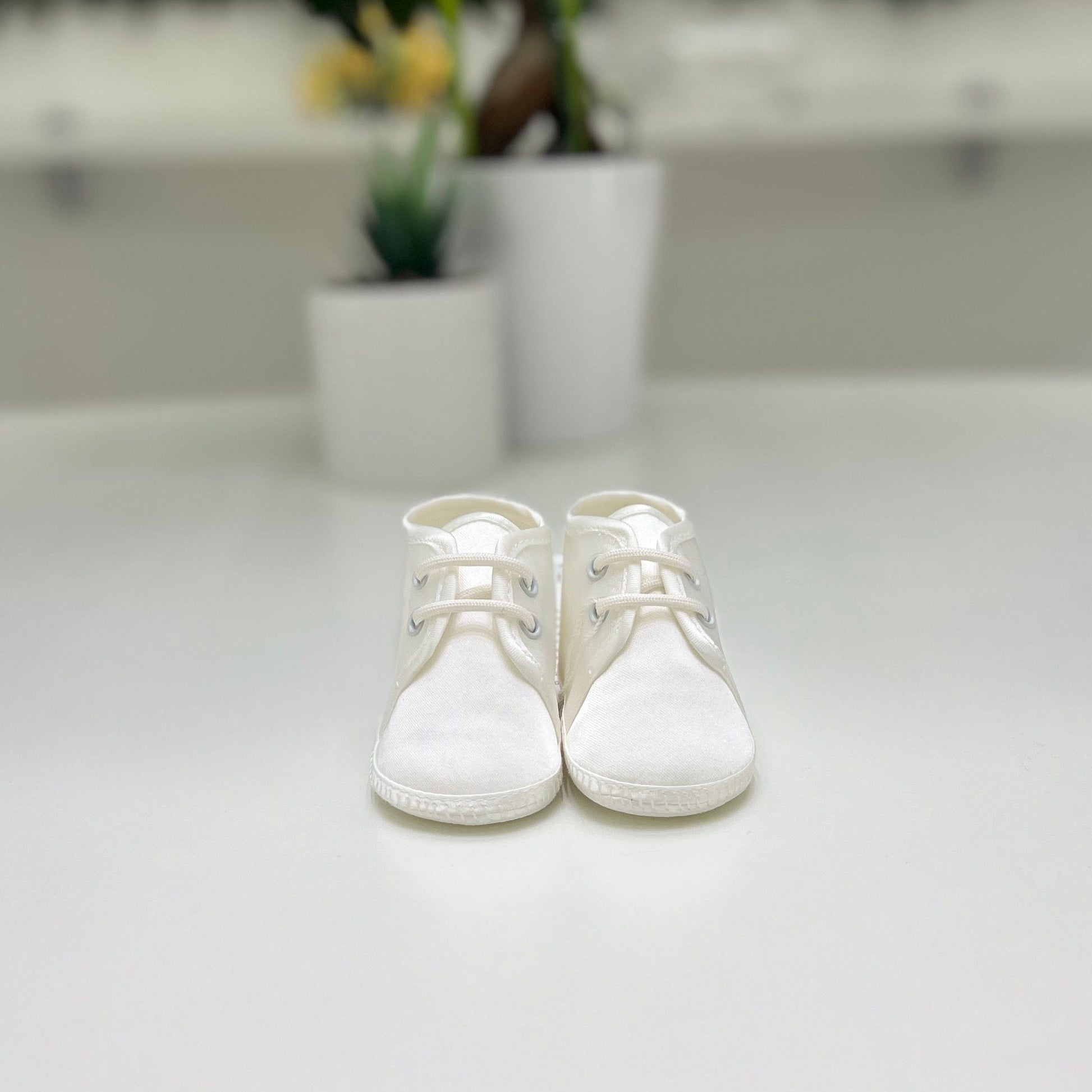 Scarpina battesimale da culla per neonato in tessuto liscio, un accessorio elegante e studiato nei minimi dettagli per completare il look del tuo piccolo nel giorno del suo battesimo.