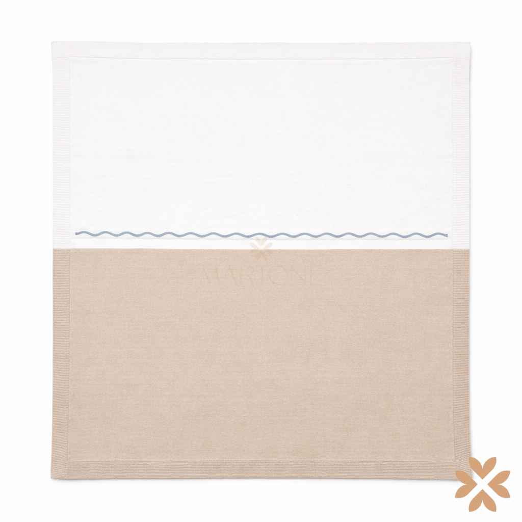 Coperta neonato in filo di cotone con lavorazione liscia e motivo ondulato a contrasto. Rifinitura perimetrale pulita. Dimensioni ideali per carrozzina e culla.