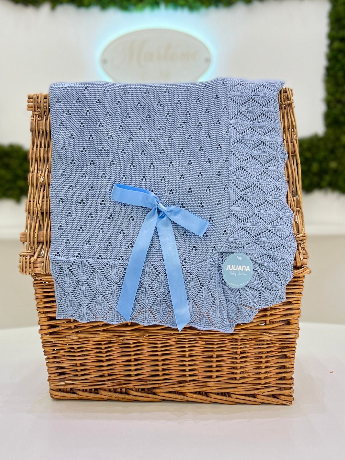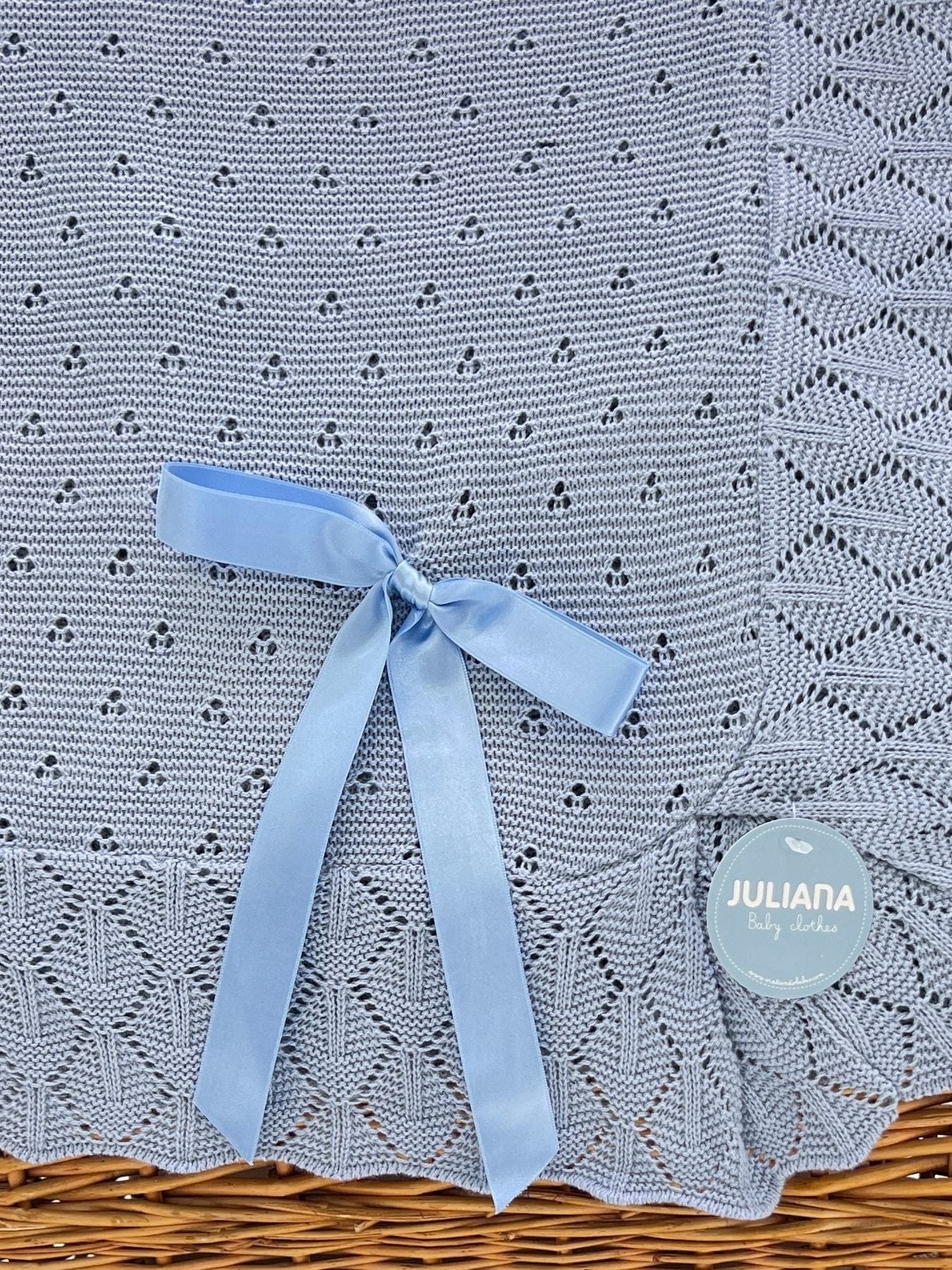 Copertina smerlata in filo di cotone, trama traforata e fiocco in raso.