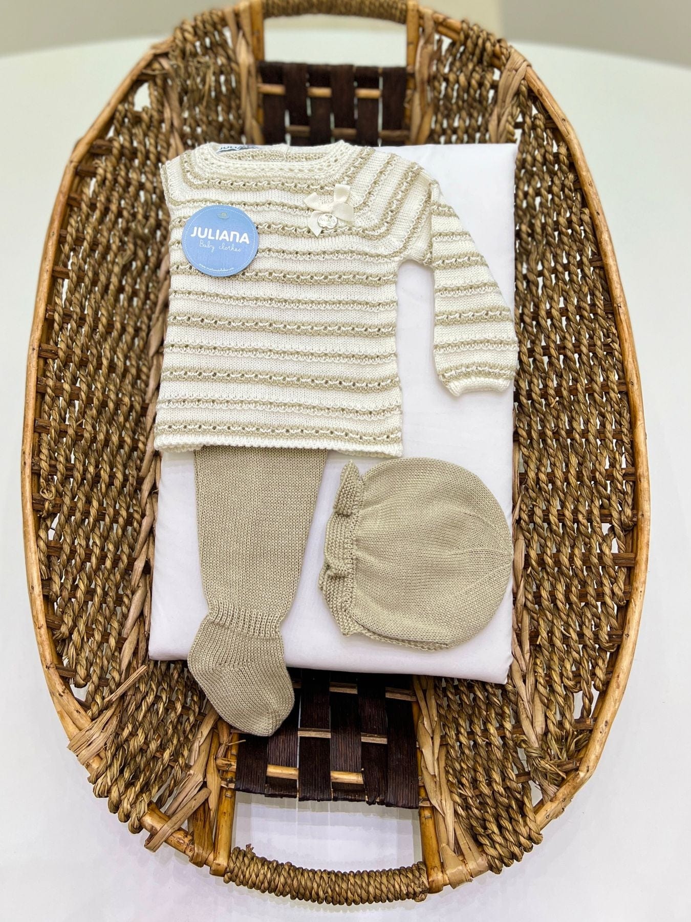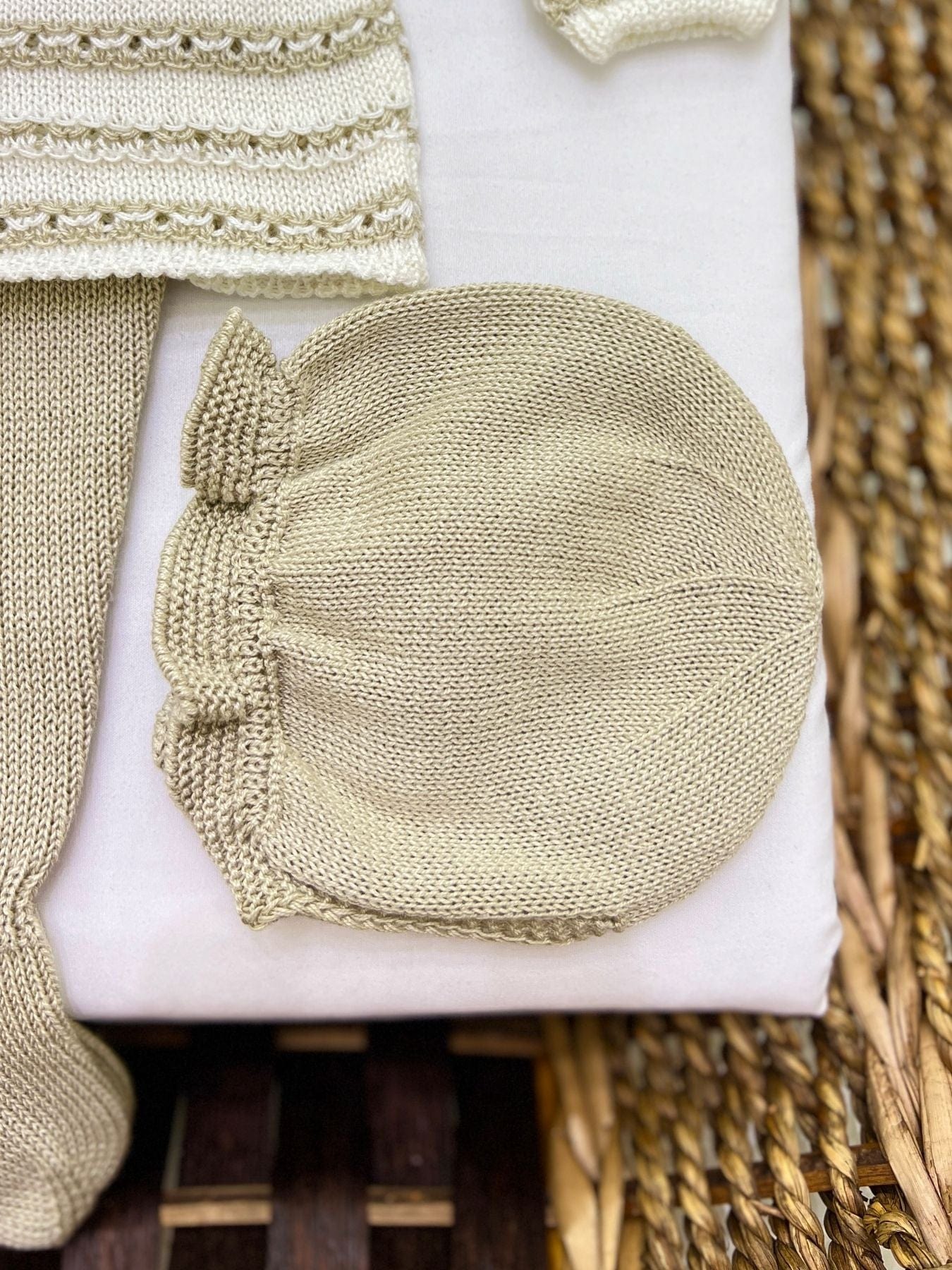 Completo clinico unisex in filo di cotone con cuffia, con trama traforata ad intreccio in beige e panna.