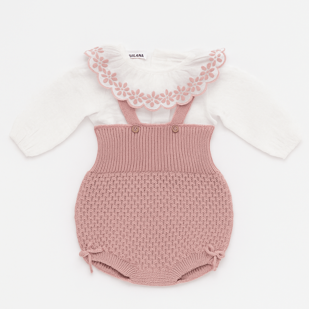 Salopette in maglia rosa con lavorazione a punto traforato e bretelle con bottoni. Blusa avorio con colletto ricamato. Un insieme ricercato dalla femminilità delicata.