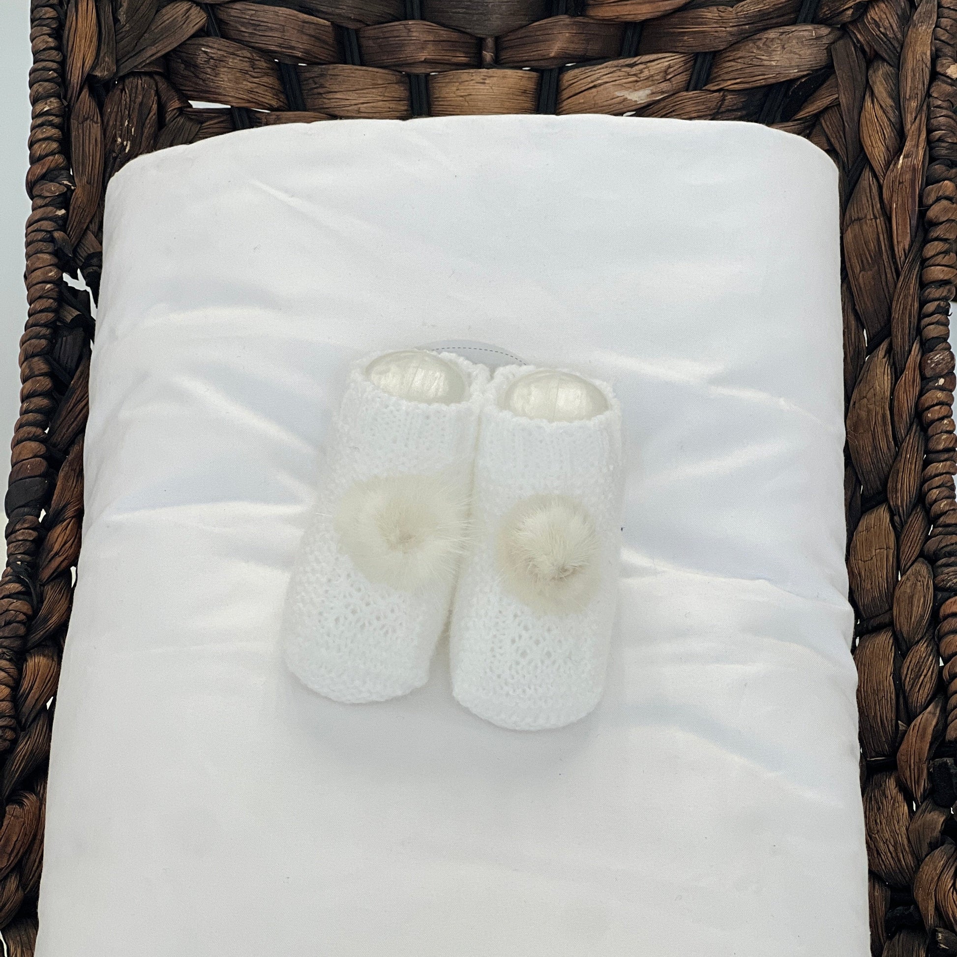 Scarpette da culla realizzate in lana sintetica soffice, offrono una vestibilità comoda e sicura. Come decorazione, hanno adorabili pompon sulla parte superiore, aggiungendo un tocco di allegria.