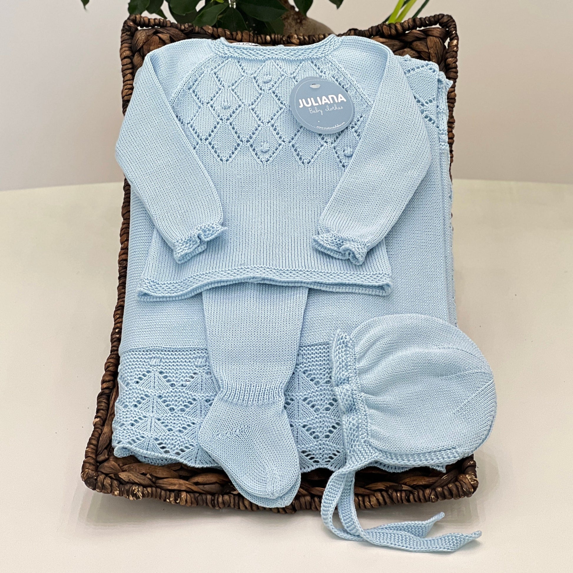 Tutina due pezzi con ghettine in filo di cotone, lavorazione a rombi con nodini ricamati e cuffia coordinata.
