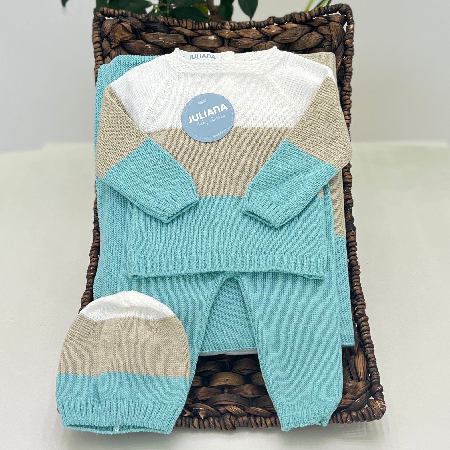 Tutina spezzata in filo di cotone e cappellino coordinato, fantasia a righe.