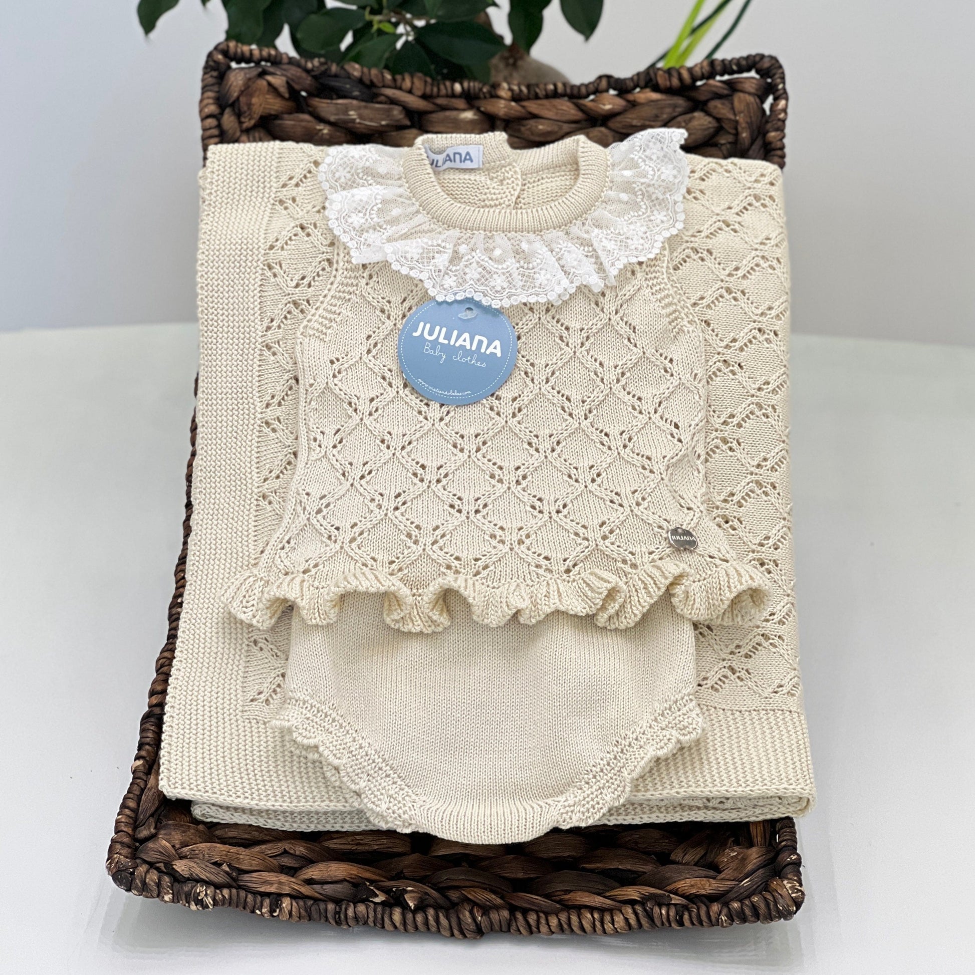 Completo neonata in filo di cotone composto da canotta con lavorazione a rombi traforata e colletto con rouches in merletto e culotte copri pannolino con bordi arricciati.