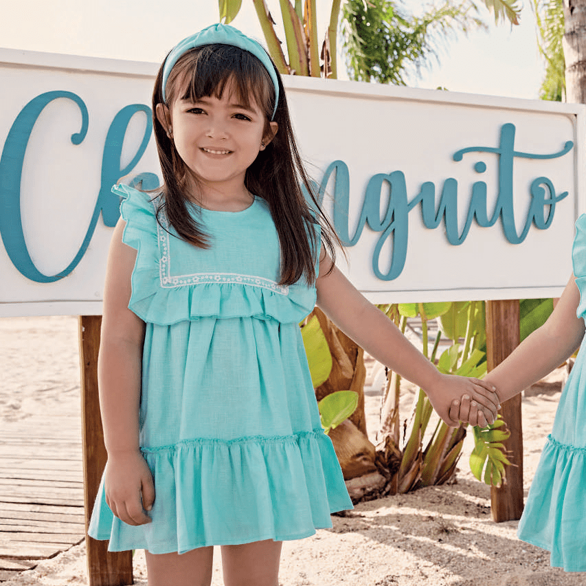 Abitino svasato a balze in lino con dettagli in pizzo.