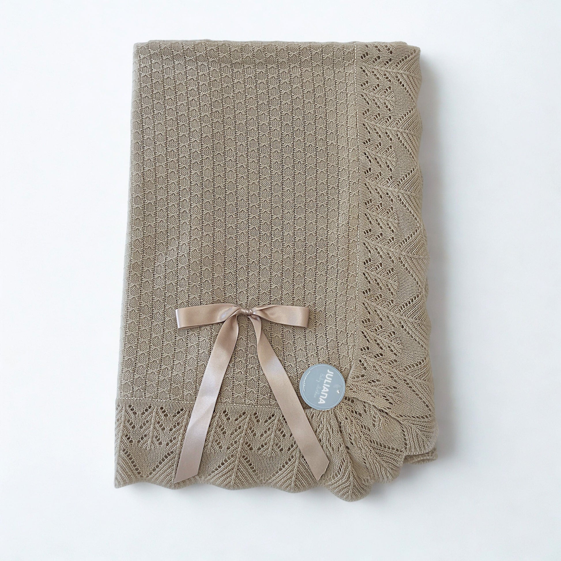 Scialle per neonati in lana sintetica, con lavorazione traforata e bordo smerlato. Completo di fiocco in raso coordinato.