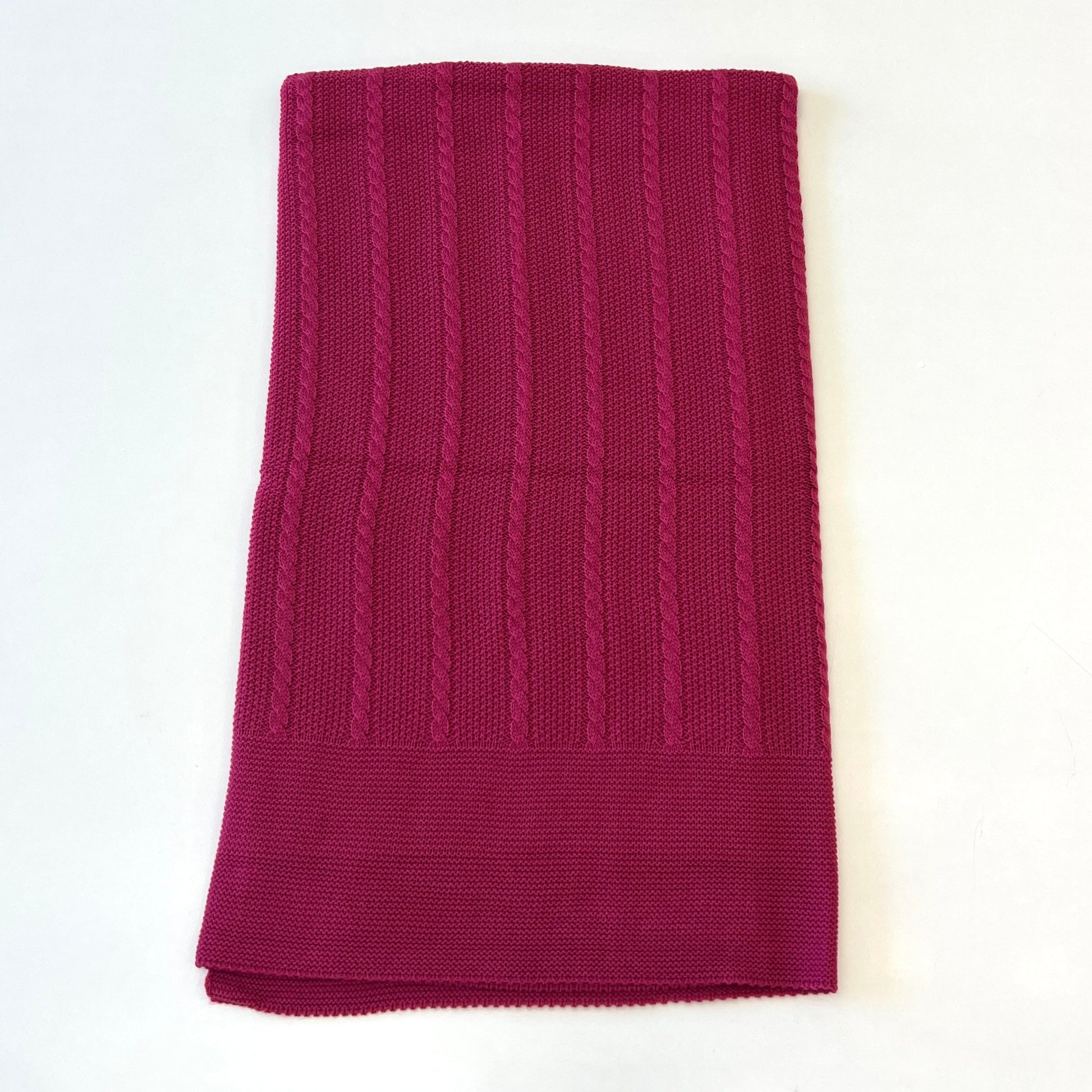 Coperta in lana rosa con trecce verticali e bordo lavorato tono su tono.