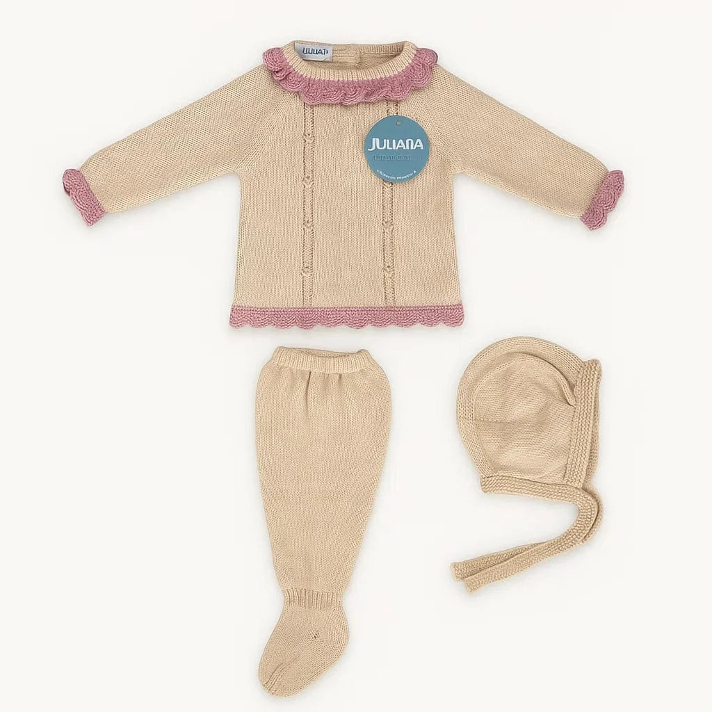 Tutina spezzata in lana per neonata con cuffia e ghettine, lavorazione a nodini in rilievo e bordini a contrasto rosa.