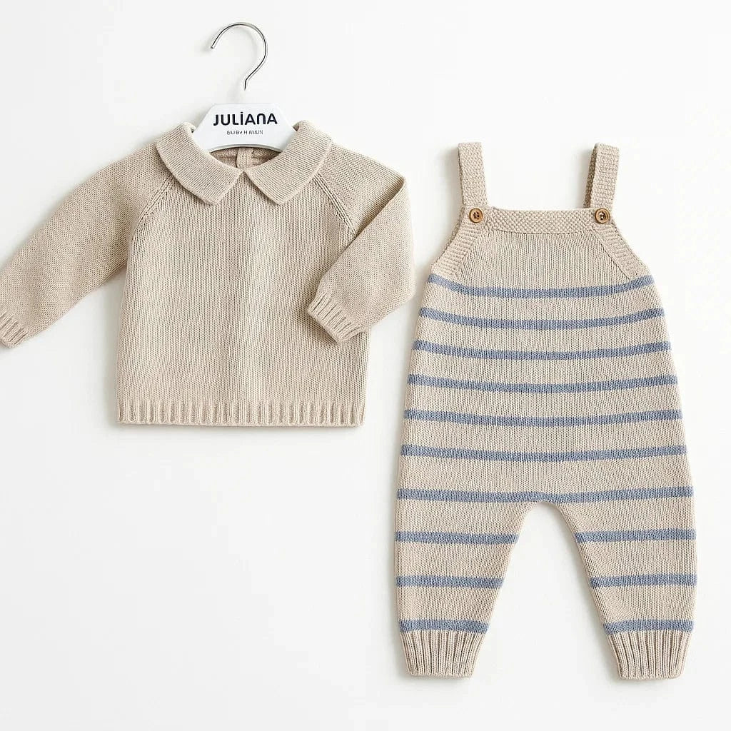 Salopette in lana per neonato con fantasia a righe crema e grigio, dal taglio confortevole e caldo. Completa l’outfit la maglia con colletto, per un tocco classico e raffinato. Perfetta per le giornate più fresche.