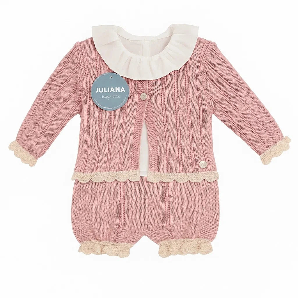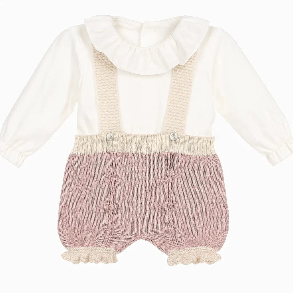 Completo in lana per neonata composto da pantaloncino a palloncino con bretelle, blusa con colletto rifinito da rouche e cardigan coordinato. Un look elegante e caldo, perfetto per le occasioni speciali della stagione.